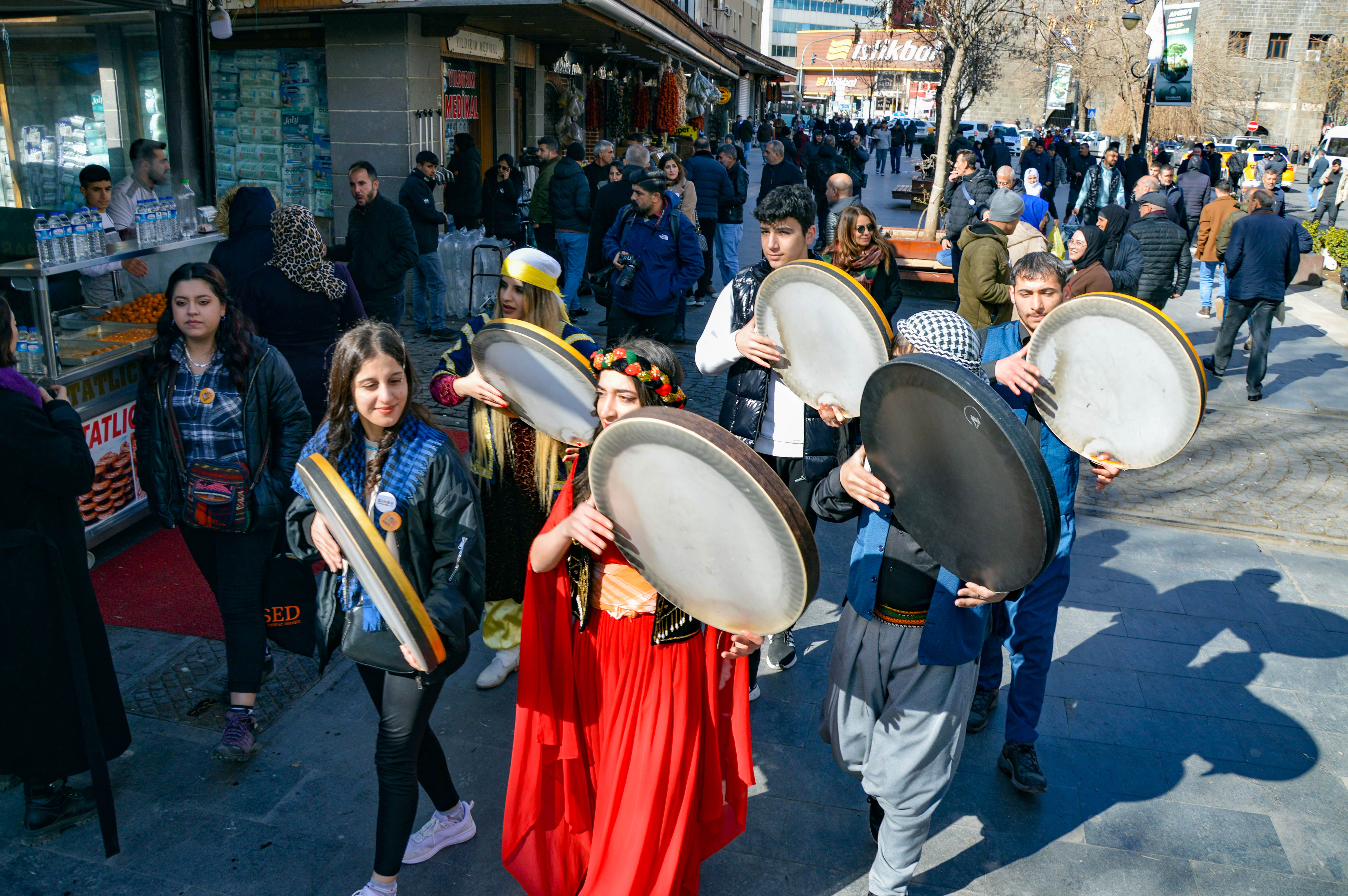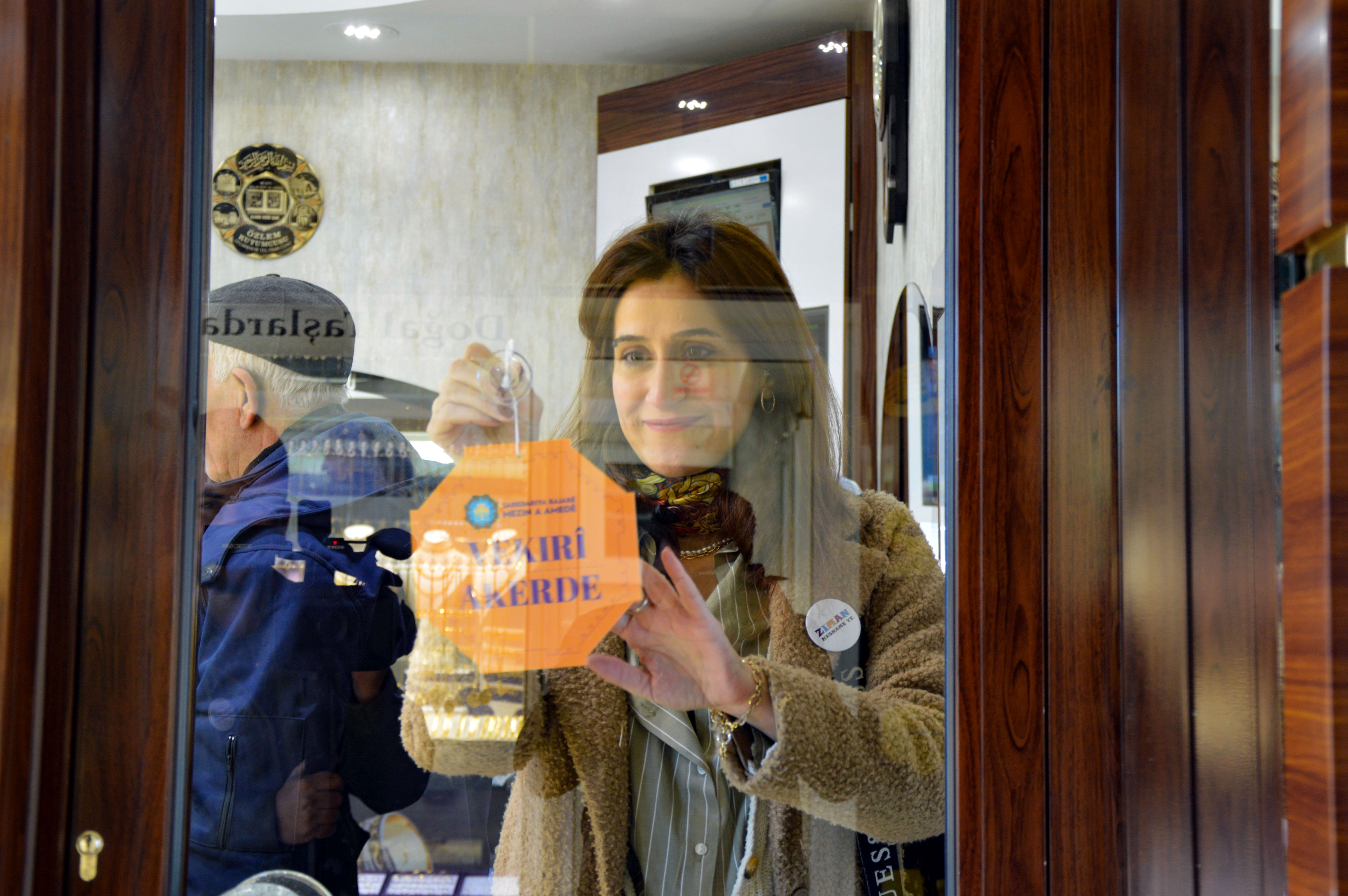 During the event, accompanied by frame drums, brochures in Kurdish, “open/closed” shop signs, badges and stickers raising awareness about language sensitivity were distributed to shopkeepers and residents.