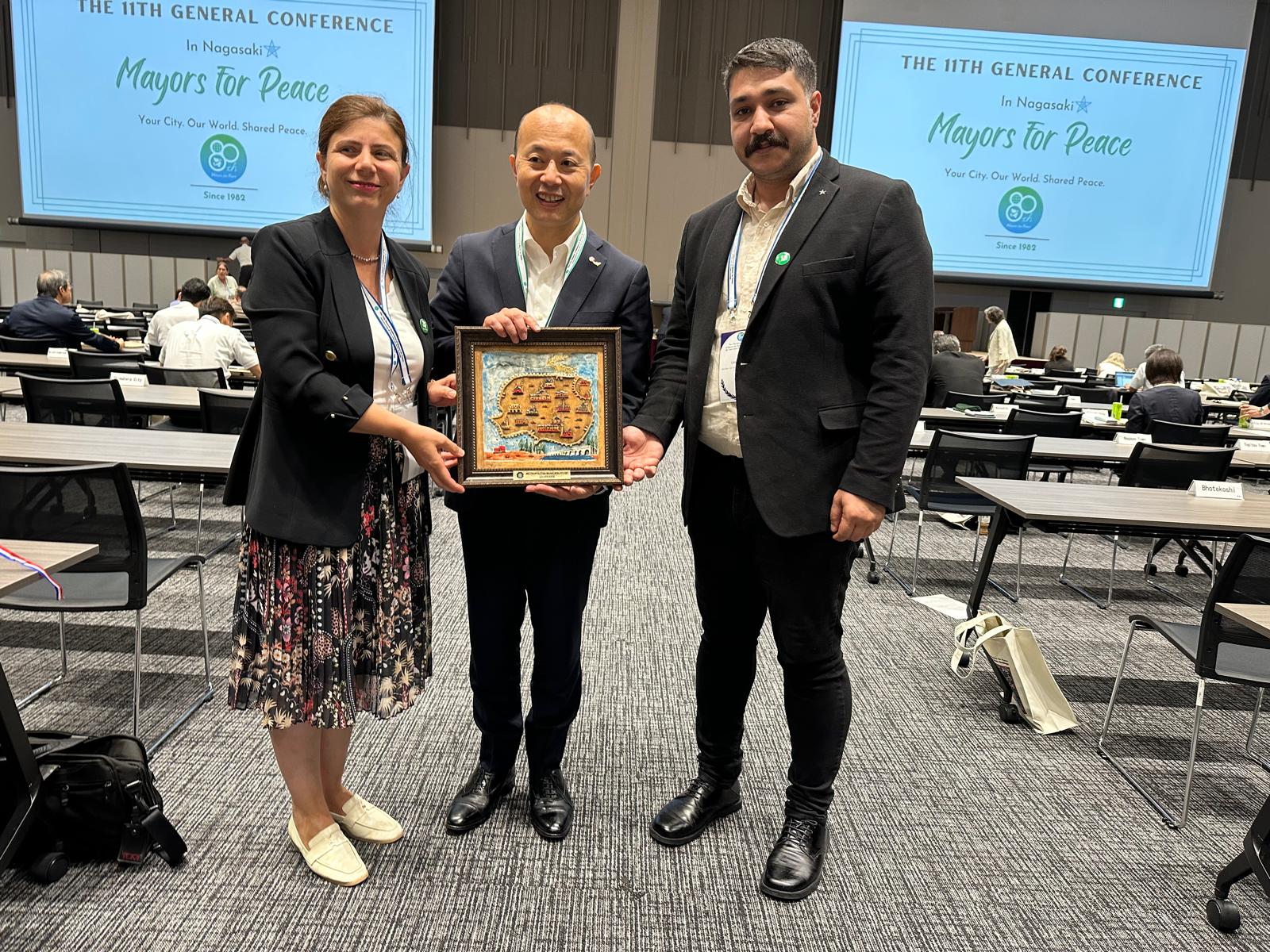 Following the meeting, Co-Mayor Bucak presented ceramic artworks depicting the Diyarbakır City Walls to the mayors of Nagasaki and Hiroshima.