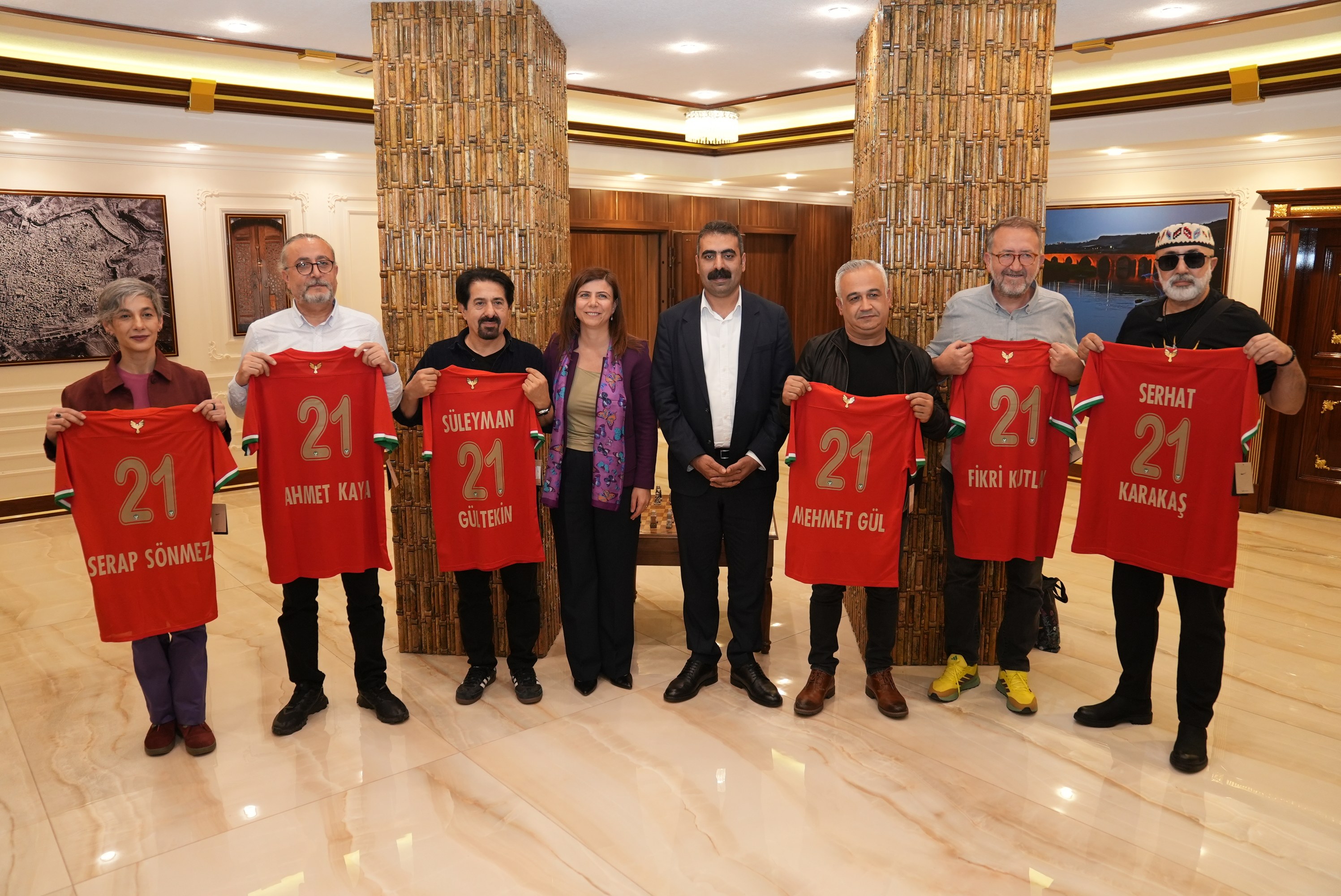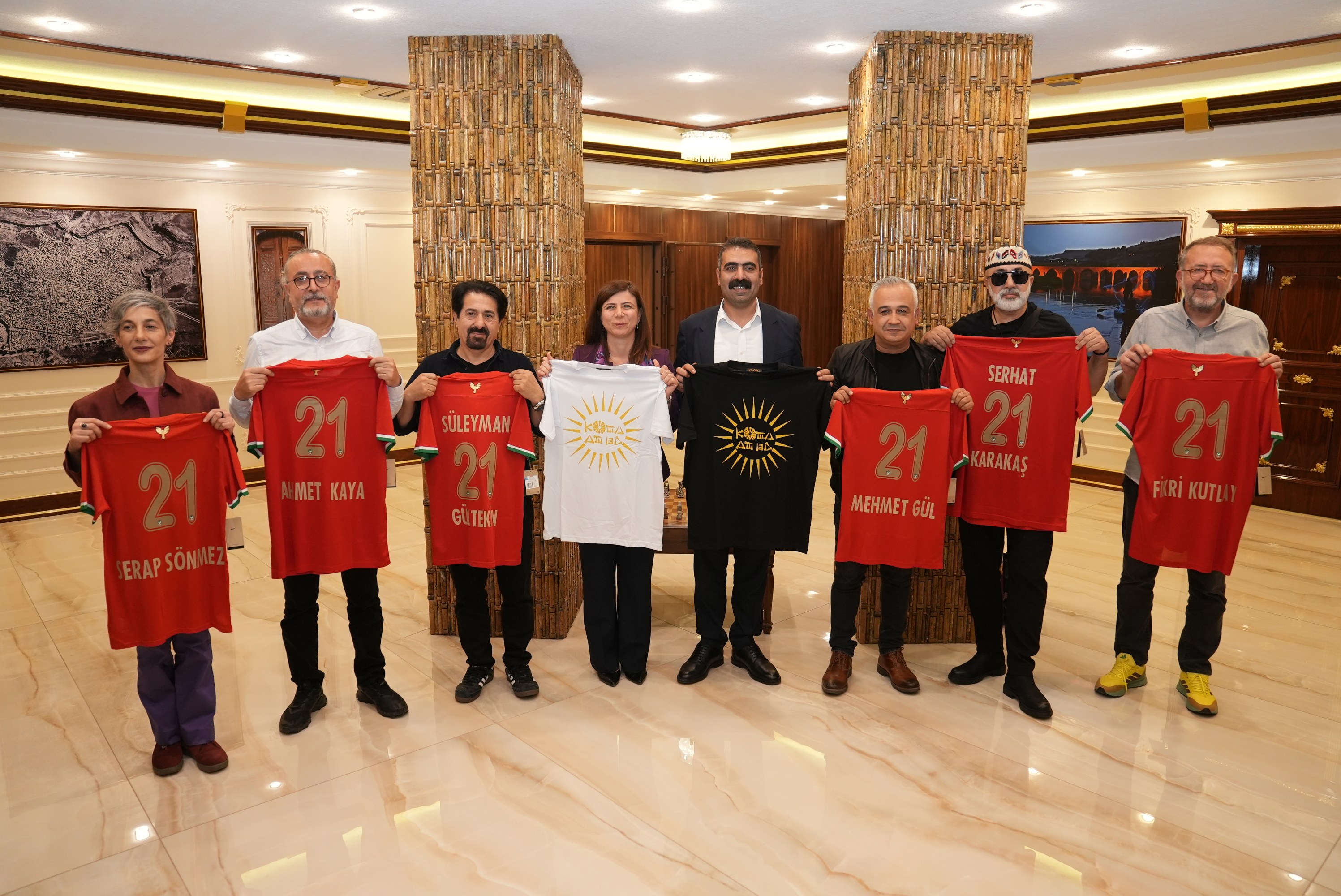 The Co-Mayors presented Koma Amed members with Amedspor shirts, while the band members gifted T-shirts bearing the band’s name to the Co-Mayors.