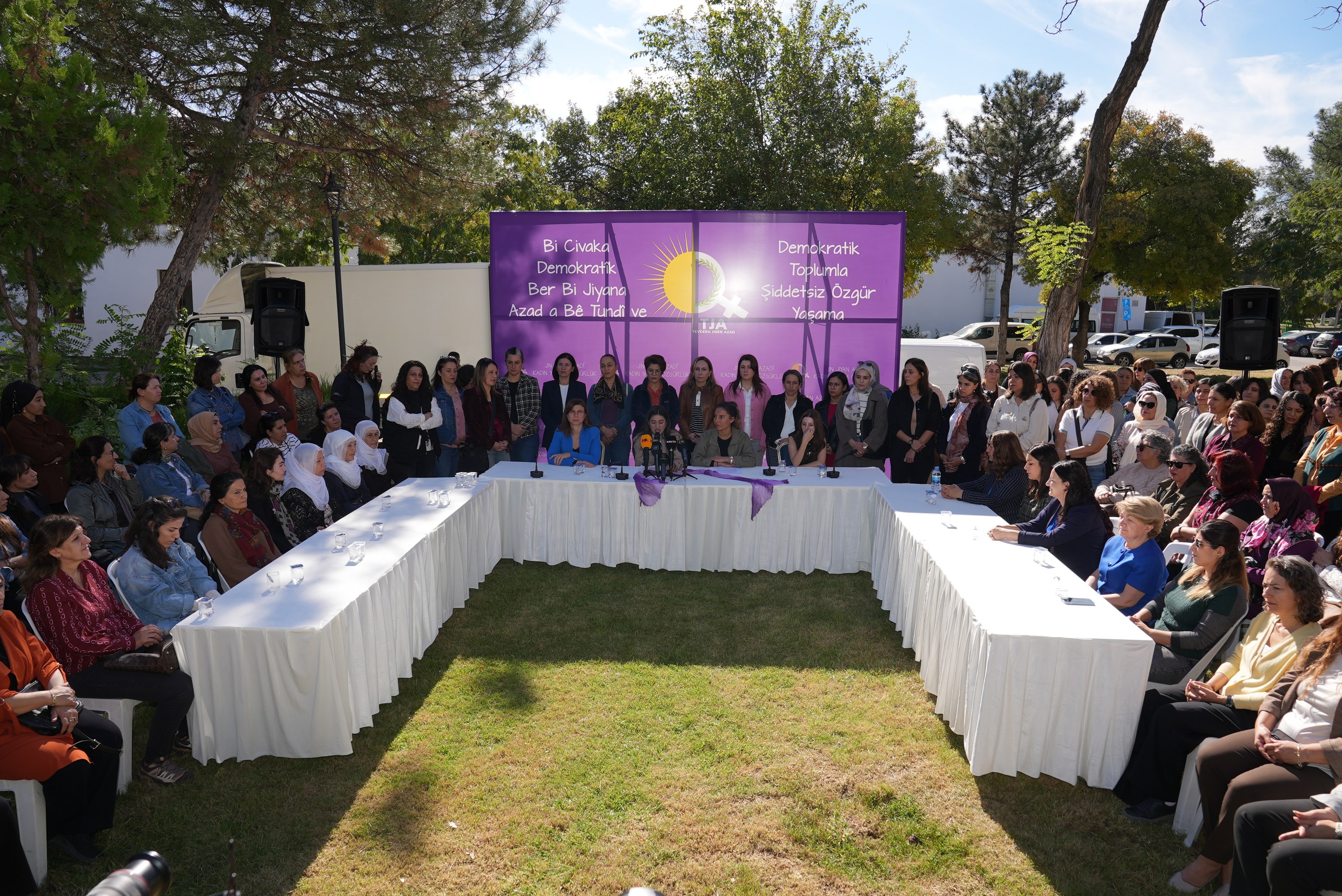 Gathering under the slogan “Living free from violence in a democratic society,” women’s organisations were joined by Co-Mayor Serra Bucak, DBB Council Co-Spokesperson Demet Ceylan, district co-mayors, DBB Deputy Chief Executive Zerin Türk, the Peoples’ Equality and Democracy Party (DEM Party) Diyarbakır Provincial Co-Chair Gülşen Özer, and women representatives from political parties and civil society organisations.