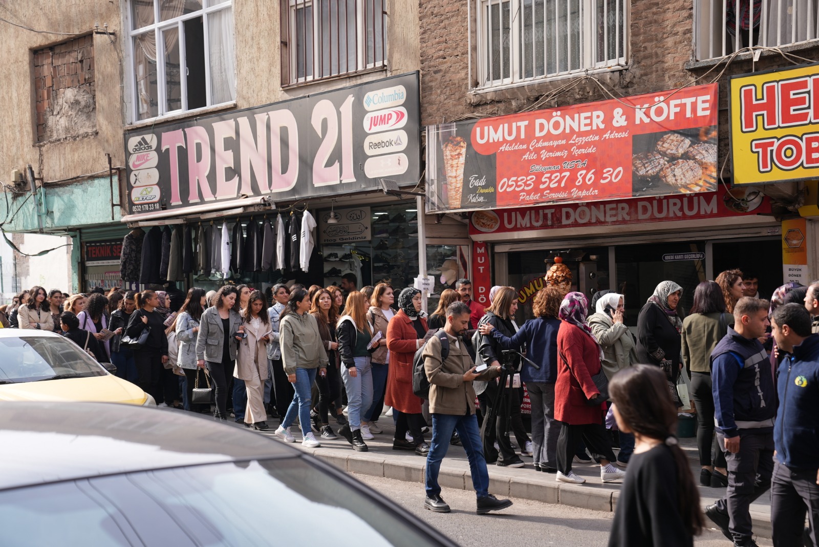 Following the statement, a short video presentation was shown, providing contact information for the municipalities’ solidarity centres and referral mechanisms. After the screening, the Co-Mayors held a march along Nükhet Coşkun Street, distributing stickers and leaflets to shopkeepers to raise awareness about violence against women.