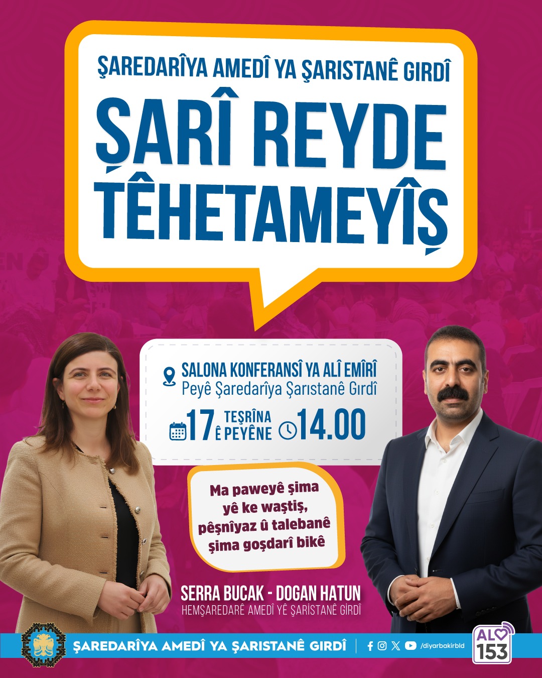 Diyarbakır Metropolitan Municipality Co-Mayors Serra Bucak and Doğan Hatun will meet residents on 17 November as part of a “Public Meeting” event.