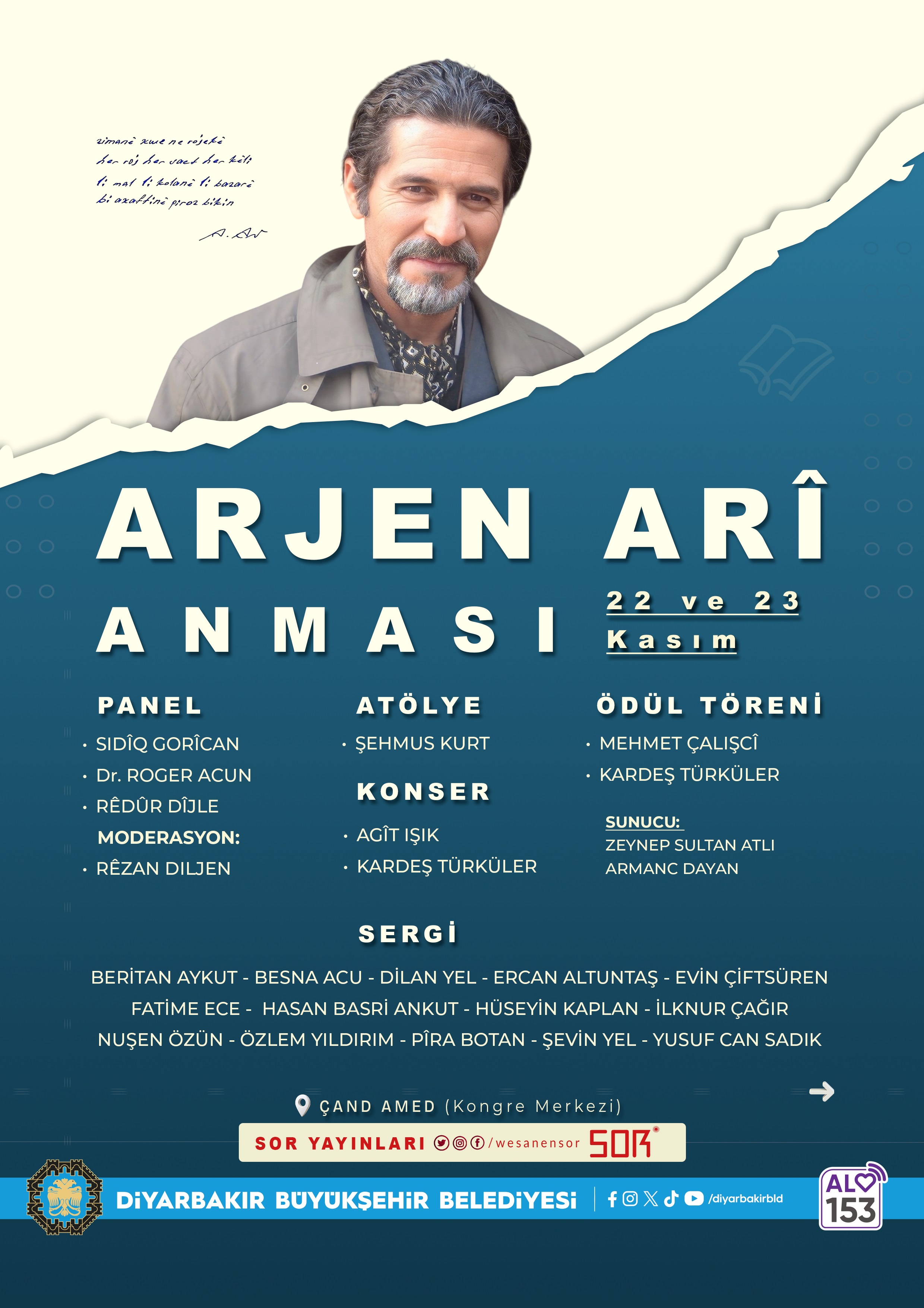 Arjen Arî, who passed away from cancer in Diyarbakır on 30 October 2012, will be remembered on the 13th anniversary of his death through various activities. This year, exhibitions, an award ceremony, a workshop, a panel and a concert organised by Diyarbakır Metropolitan Municipality’s Department of Culture and Social Affairs, Sor Publishing and the Arî family will be held on 22–23 November at the Çand Amed Culture and Congress Centre.