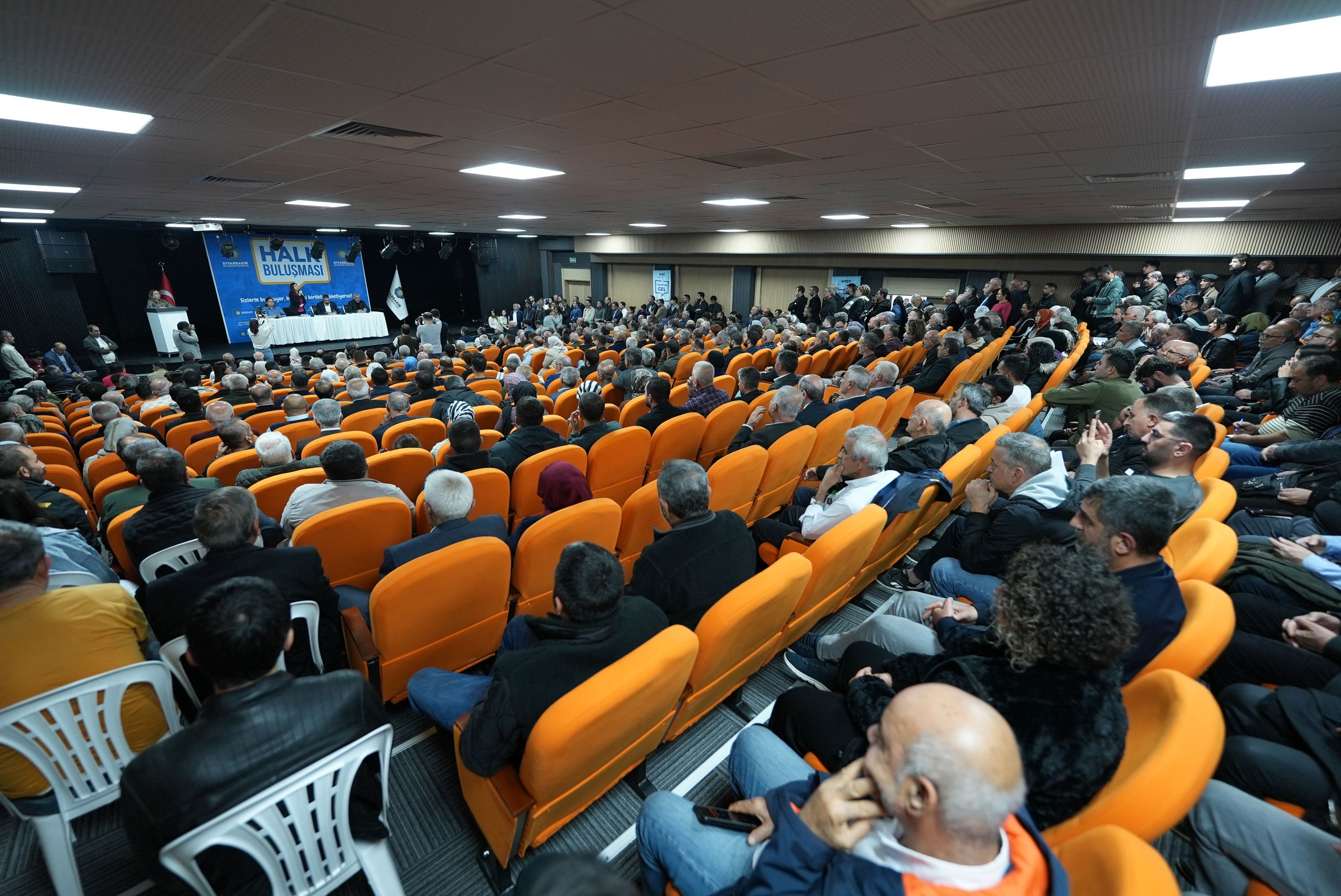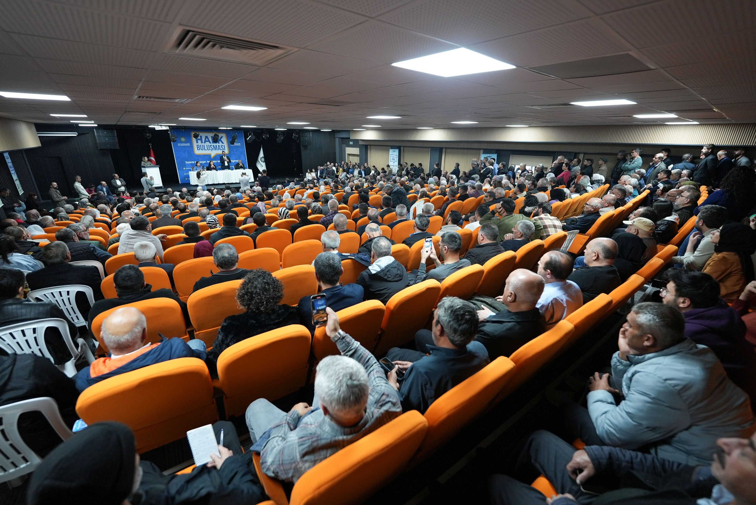 The Department of Press and Public Relations is continuing to organise public meetings to enable residents to convey their demands, suggestions and views directly to the municipal administration. Within this framework, Co-Mayors Serra Bucak and Doğan Hatun met with hundreds of residents in the Ali Emiri Conference Hall at the municipal building. The meeting was also attended by DBB Council Co-Spokesperson Demet Ceylan; Co-Chairs of the Peoples’ Equality and Democracy Party (DEM Party) Diyarbakır Provincial Organisation, Gülşen Özer and Abbas Şahin; Co-Chairs of the Democratic Regions Party (DBP) Diyarbakır Provincial Organisation, Ruçem Vefa Elyakut and Ahmet Doğan; Secretary General Emrullah Gördük; DBB Council members and heads of departments.
