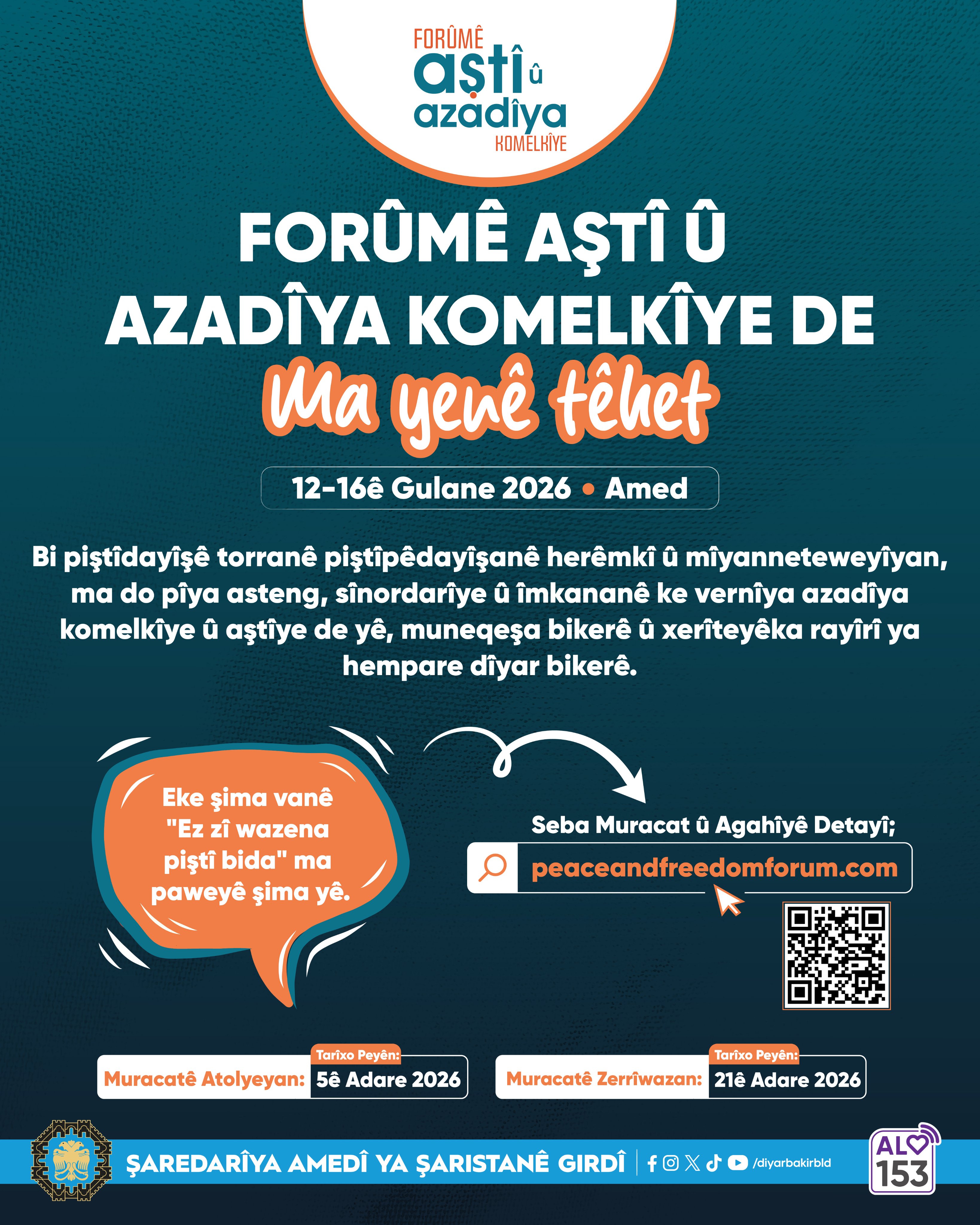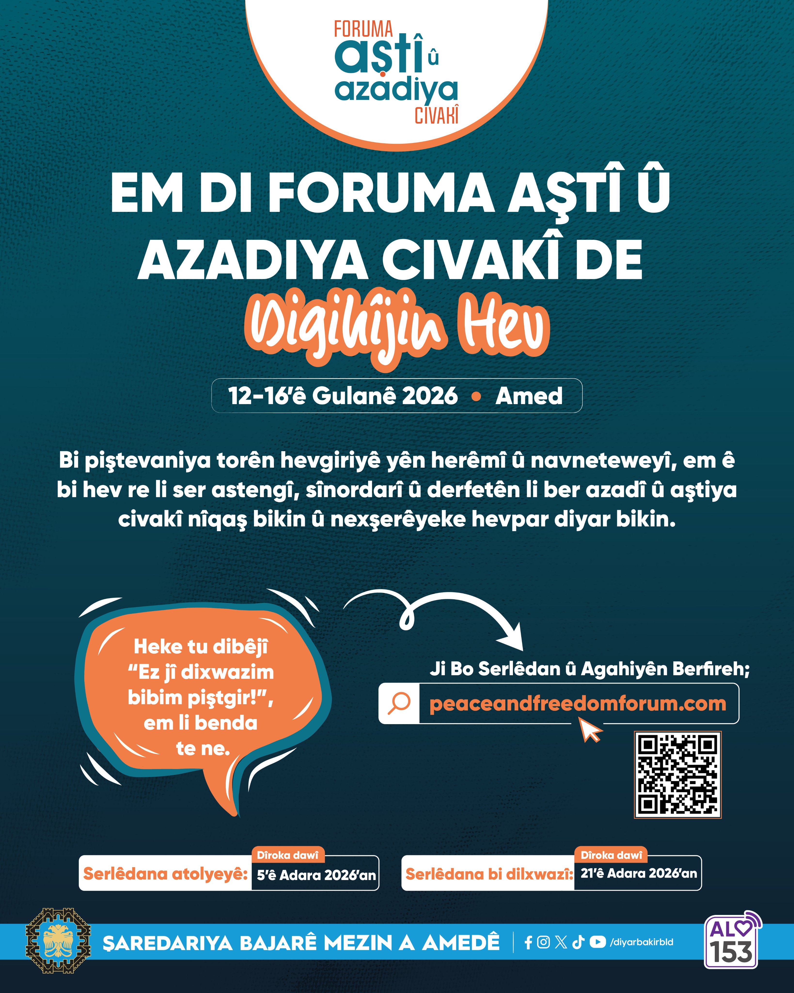 With the support of local and international solidarity networks, Diyarbakır Metropolitan Municipality will convene the “Societal Peace and Freedom Forum” in Diyarbakır on 12–16 May 2026. The Forum aims to bring together diverse sections of society to foster a shared discussion and develop a common roadmap.
