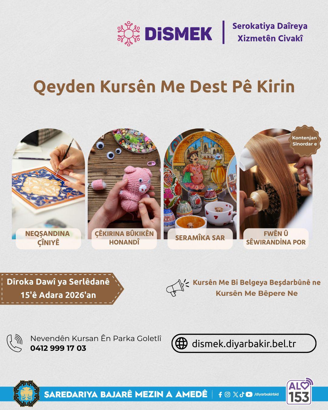 Within the scope of Diyarbakır Art and Vocational Training Courses (DİSMEK), coordinated by the Department of Social Services, the Municipality will offer courses in Tile Art Decoration, Knitted Doll Making, Cold Porcelain, and Hair Blow-Drying (Blowout).