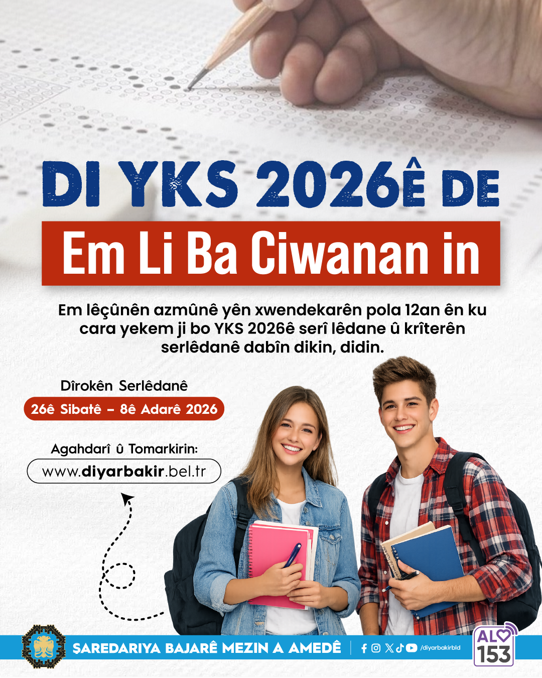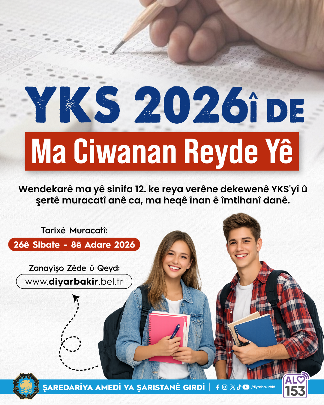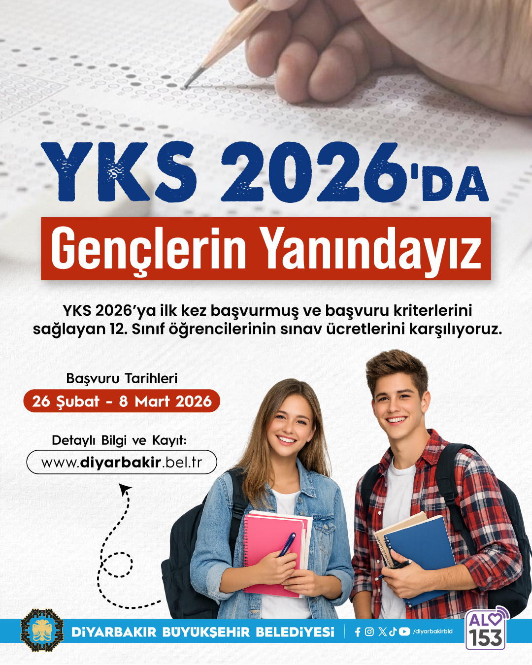 Diyarbakır Metropolitan Municipality will cover the exam fee for low-income Year 12 students who are applying to sit the 2026 Higher Education Institutions Exam (YKS) for the first time. Under the programme, support of up to TRY 1,400 per student will be provided, with applications open from 26 February to 8 March.