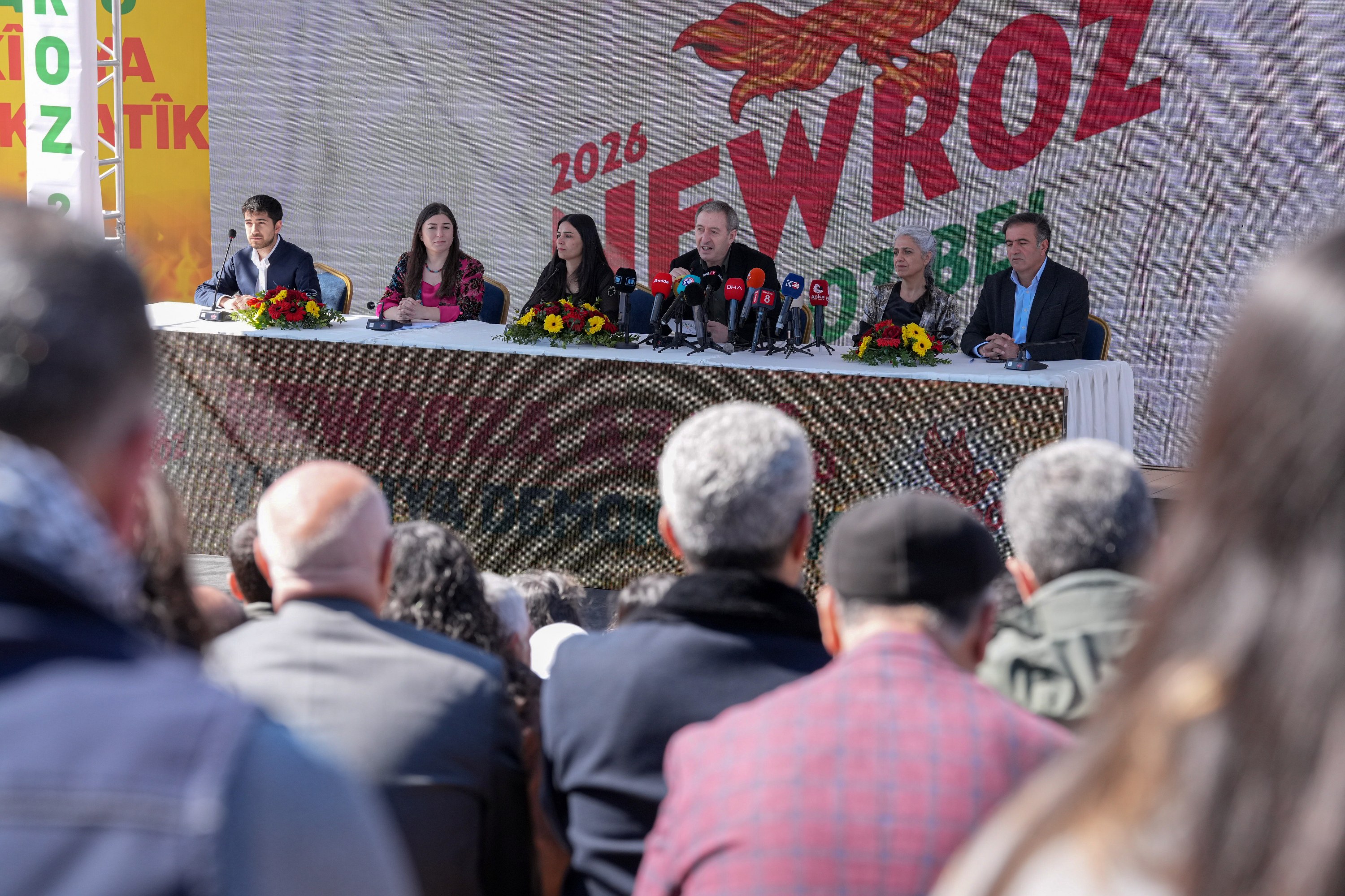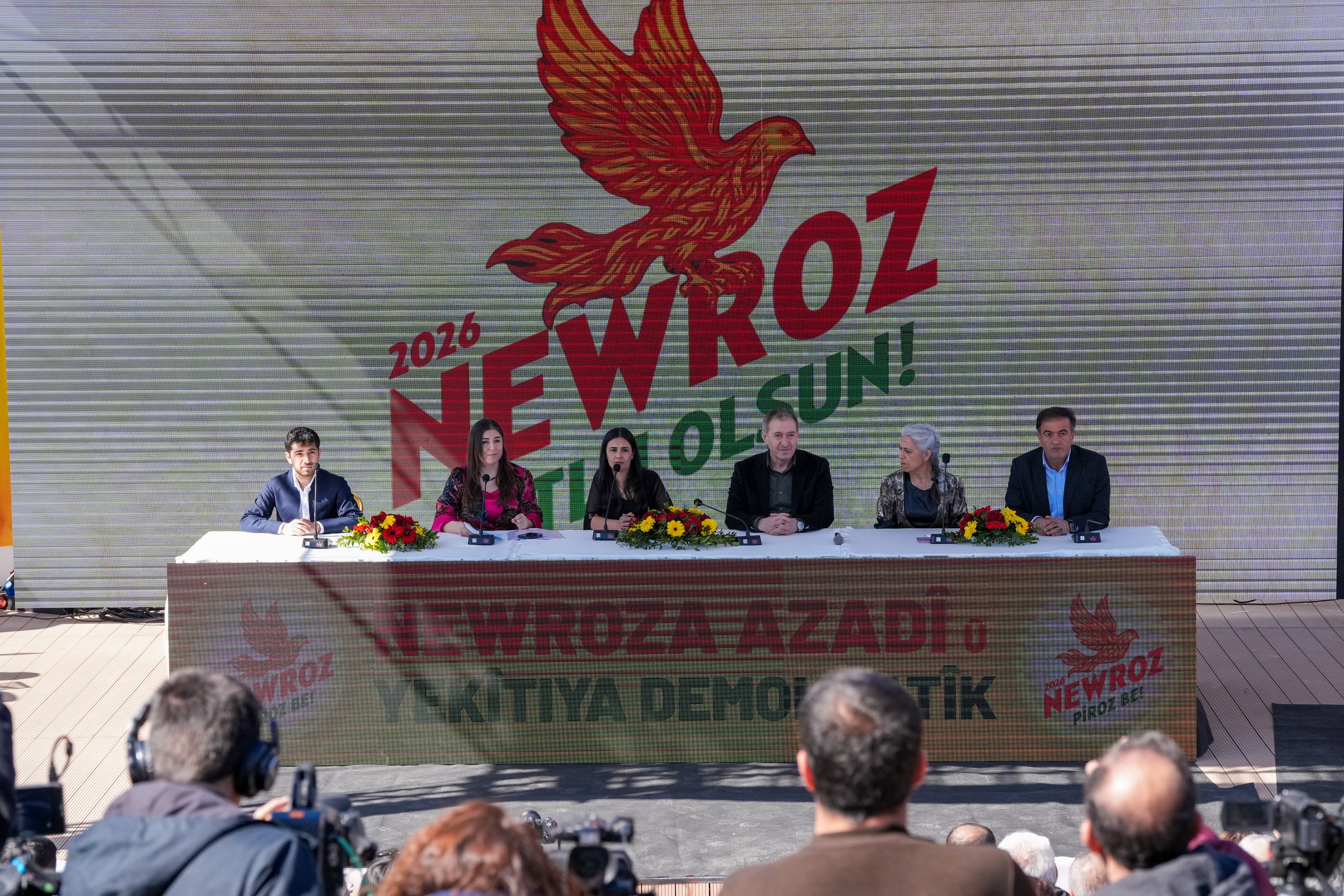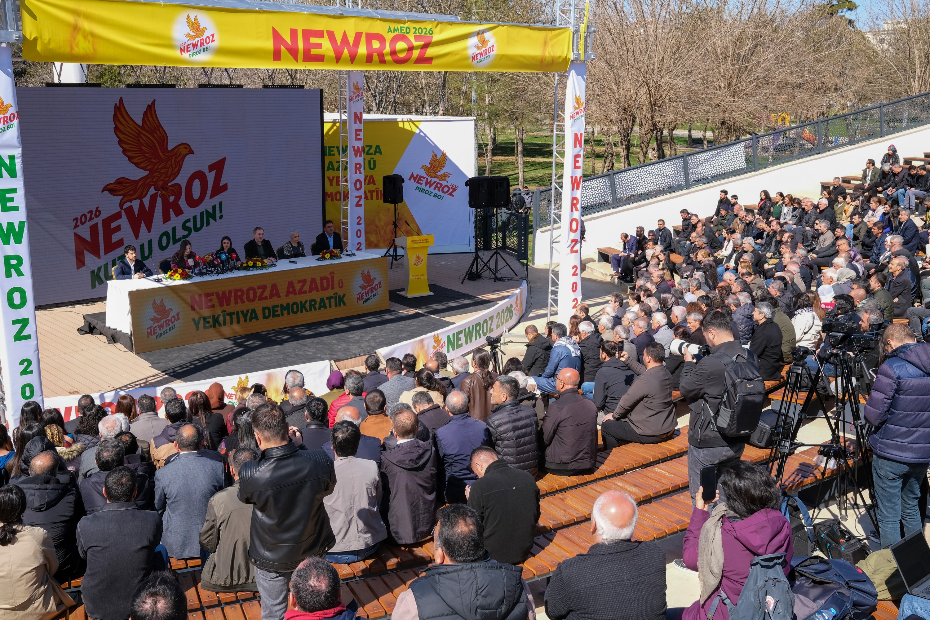 A declaration was announced in Diyarbakır regarding this year’s Newroz celebrations, which will be held in at least 53 centres. Those attending the statement at Sümerpark included Diyarbakır Metropolitan Municipality Co-Mayors Serra Bucak and Doğan Hatun; Democratic Regions Party (DBP) Co-Chairs Çiğdem Kılıçgün Uçar and Keskin Bayındır; Peoples’ Equality and Democracy Party (DEM Party) Co-Chair Tuncer Bakırhan; Democratic Unity Initiative Co-Spokesperson Mehmet Kamaç; DBB Council Co-Spokespersons Demet Ceylan and Ayhan Karatekin; as well as council members and representatives of political parties and civil society organisations.