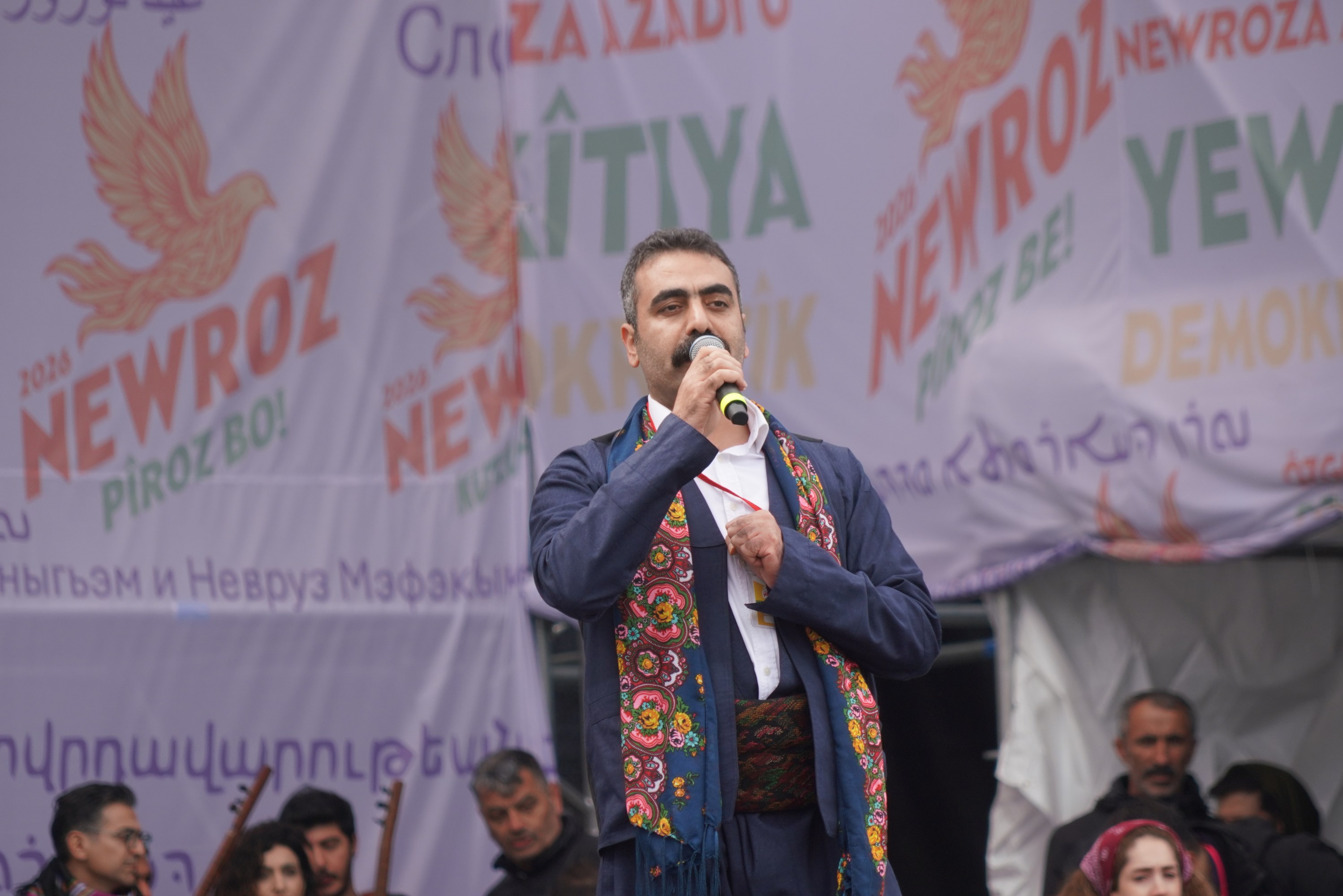 Co-Mayor Bucak wished the people of Diyarbakır a happy Newroz and Eid al-Fitr, and expressed the hope that Newroz would bring freedom, peace and unity to all peoples. Co-Mayor Hatun said: “A happy Eid and a happy Newroz to you, Amed — welcome. Amed, today you are not only Amed. Today you are Hewlêr, Sulaymaniyah and Mahabad; today you are Afrin. Today, the voice of Afrin rises through you. Happy Newroz to Afrin. Happy Newroz to Hewlêr, happy Newroz to Mahabad. Today is the Newroz of freedom; today, all cities are in Amed. Our esteemed guests are in Amed today. Welcome to you all. The voice of freedom is rising from the streets of Amed. The ears of the world are turned here — raise your voices. Happy Newroz to the Kurdish people; you honour us with your presence.”
