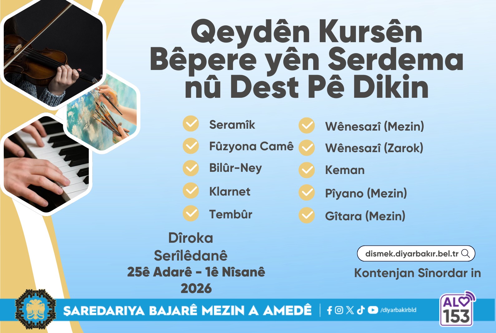 Applications will be accepted between 25 March and 1 April. Participation in the courses will be limited to available places. Applications can be submitted via dismek.diyarbakir.bel.tr.