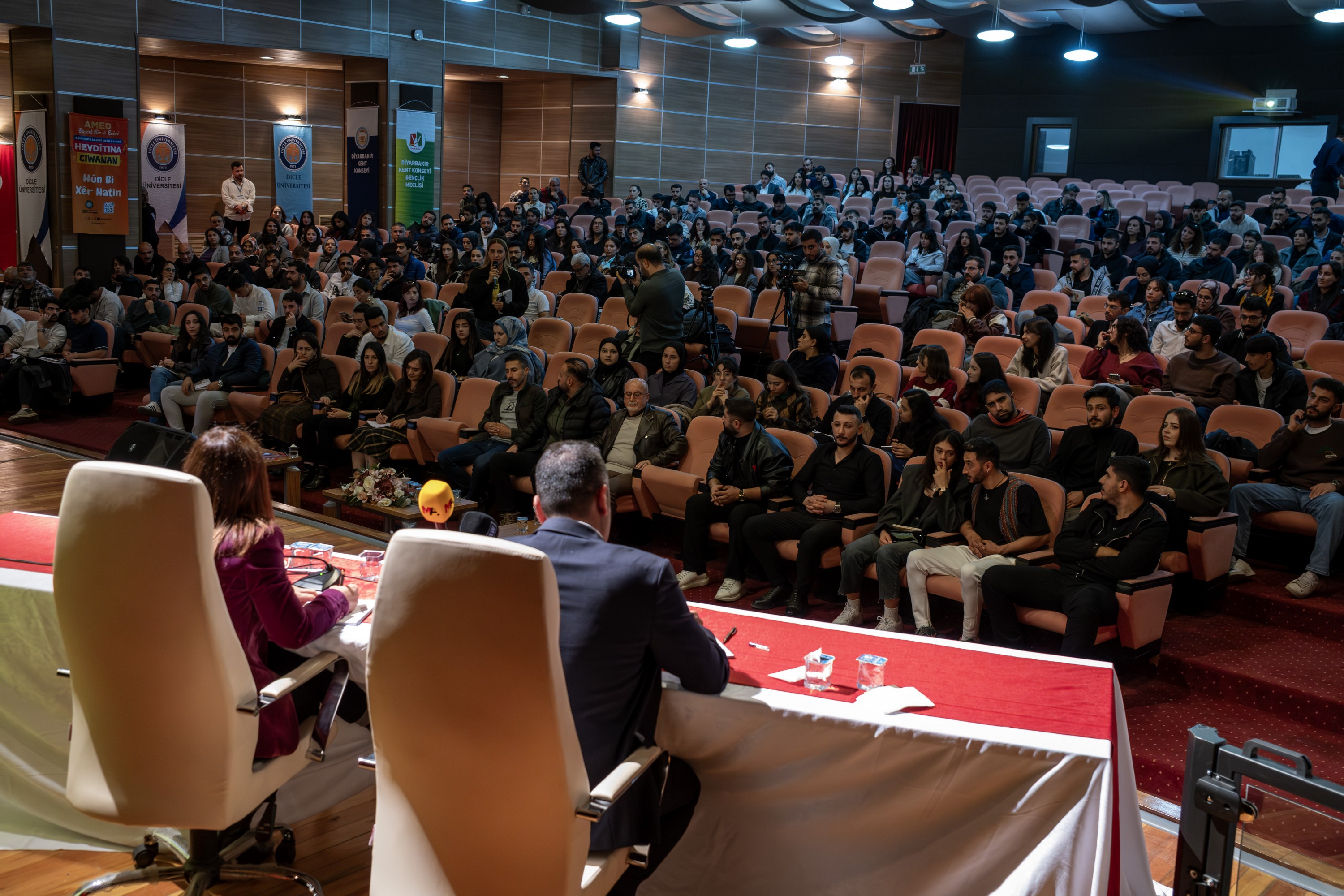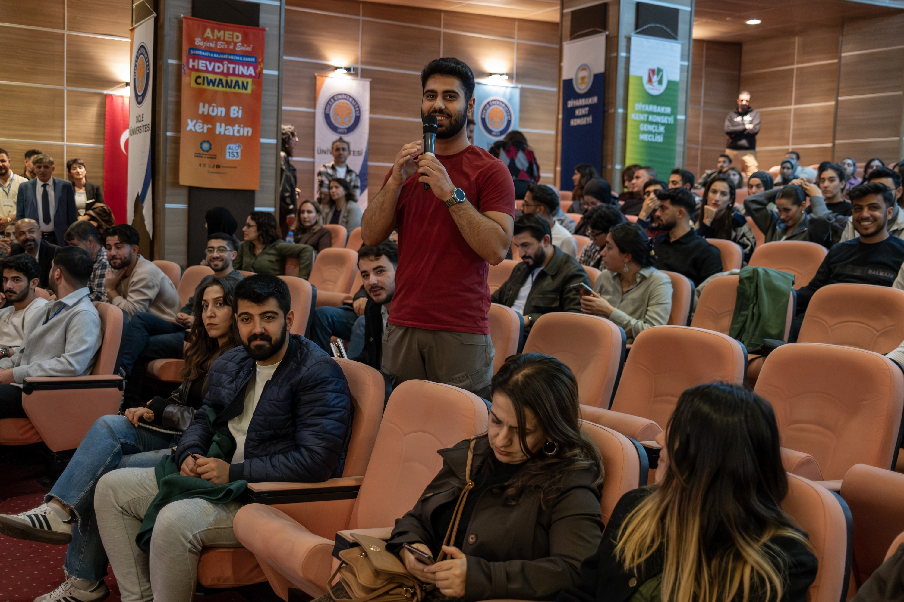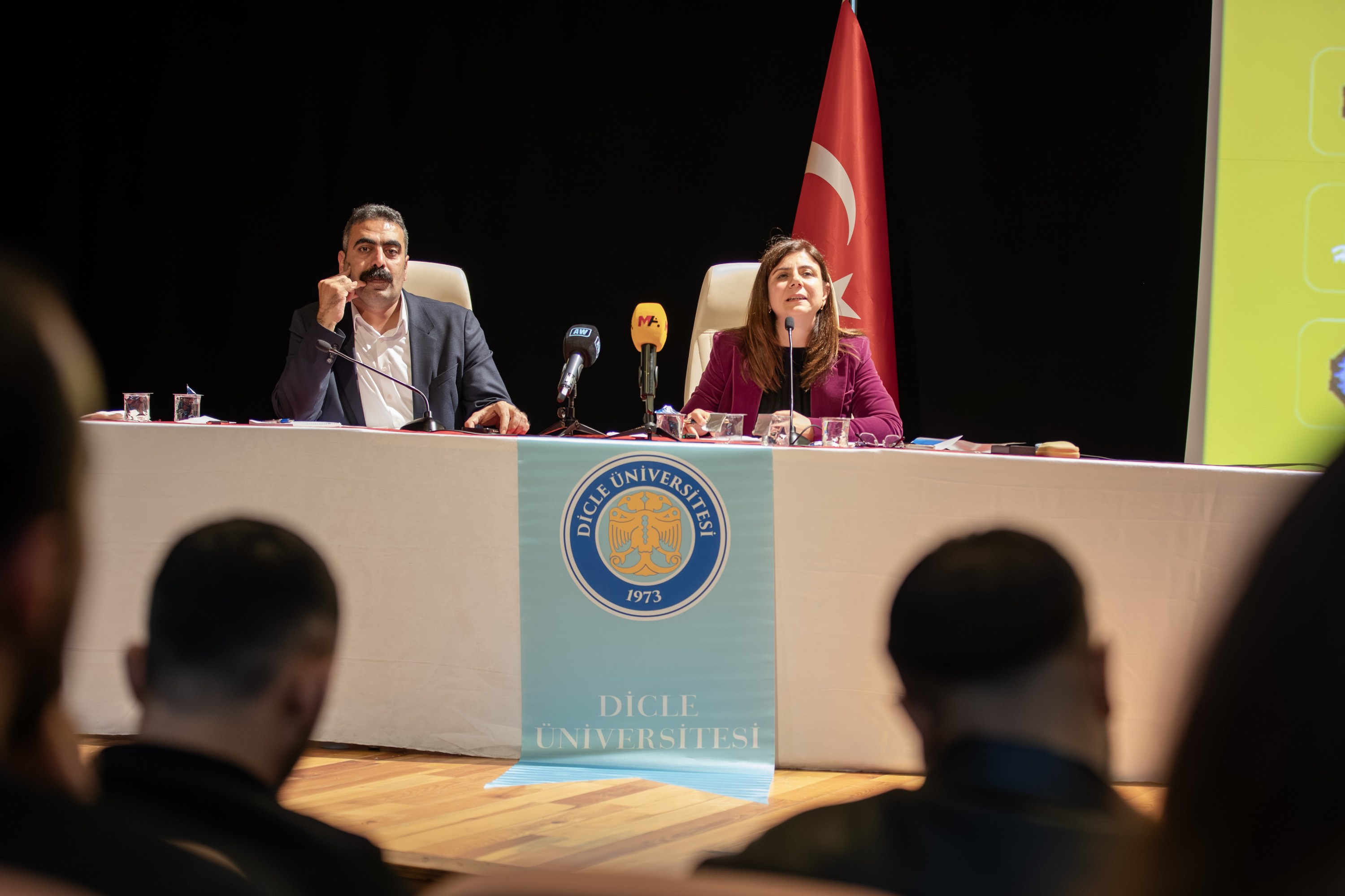 Diyarbakır Büyükşehir Belediyesi Eşbaşkanları Serra Bucak ve Doğan Hatun, üniversiteli gençlerle düzenlenen buluşmada yerel yönetim, ulaşım, ekoloji, dil çalışmaları ve demokratik katılım üzerine soruları yanıtladı.
