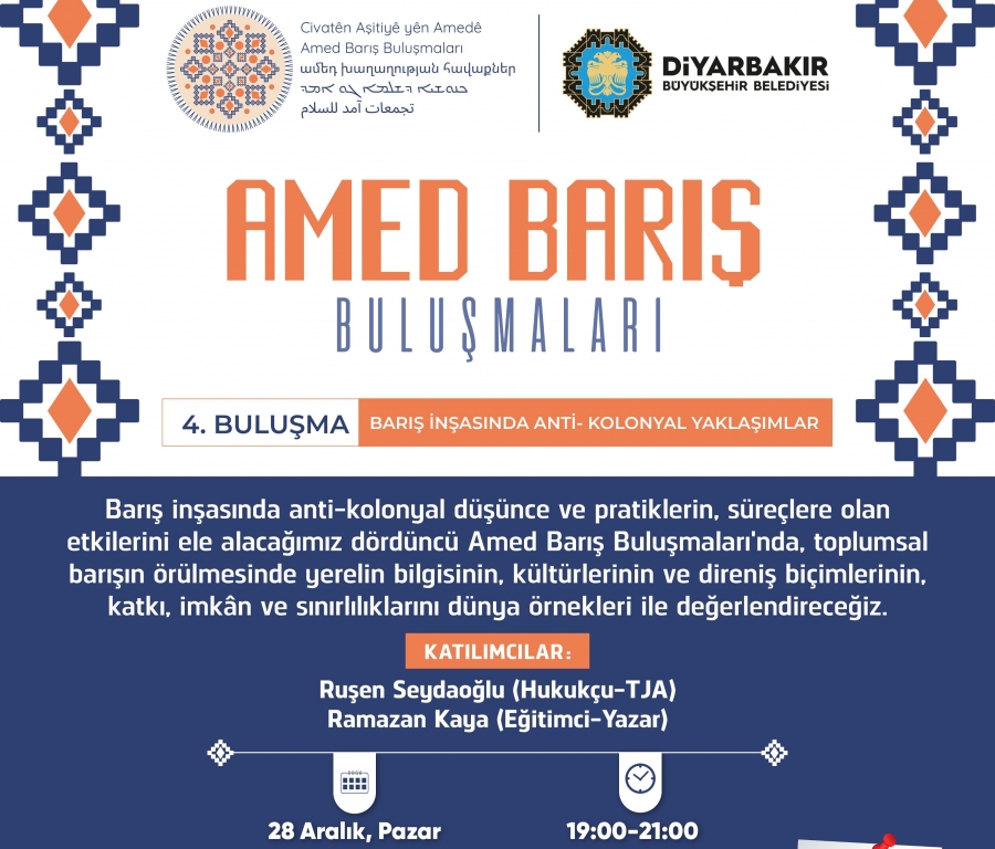Diyarbakır Büyükşehir Belediyesi tarafından yürütülen “Amed Barış Buluşmaları” programının dördüncü oturumu, “Barış İnşasında Anti-Kolonyal Yaklaşımlar” başlığıyla 28 Aralık’ta gerçekleştirilecek.