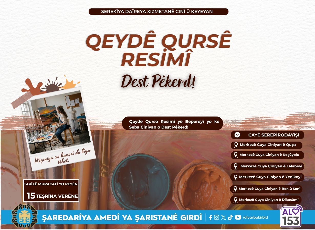Şaredariya Bajarê Mezin a Amedê, bi dirûşma "Jêhatiya xwe bi hunerê re darîçav bike", ji bo jinan kursa wêneyan (resim) vedike.