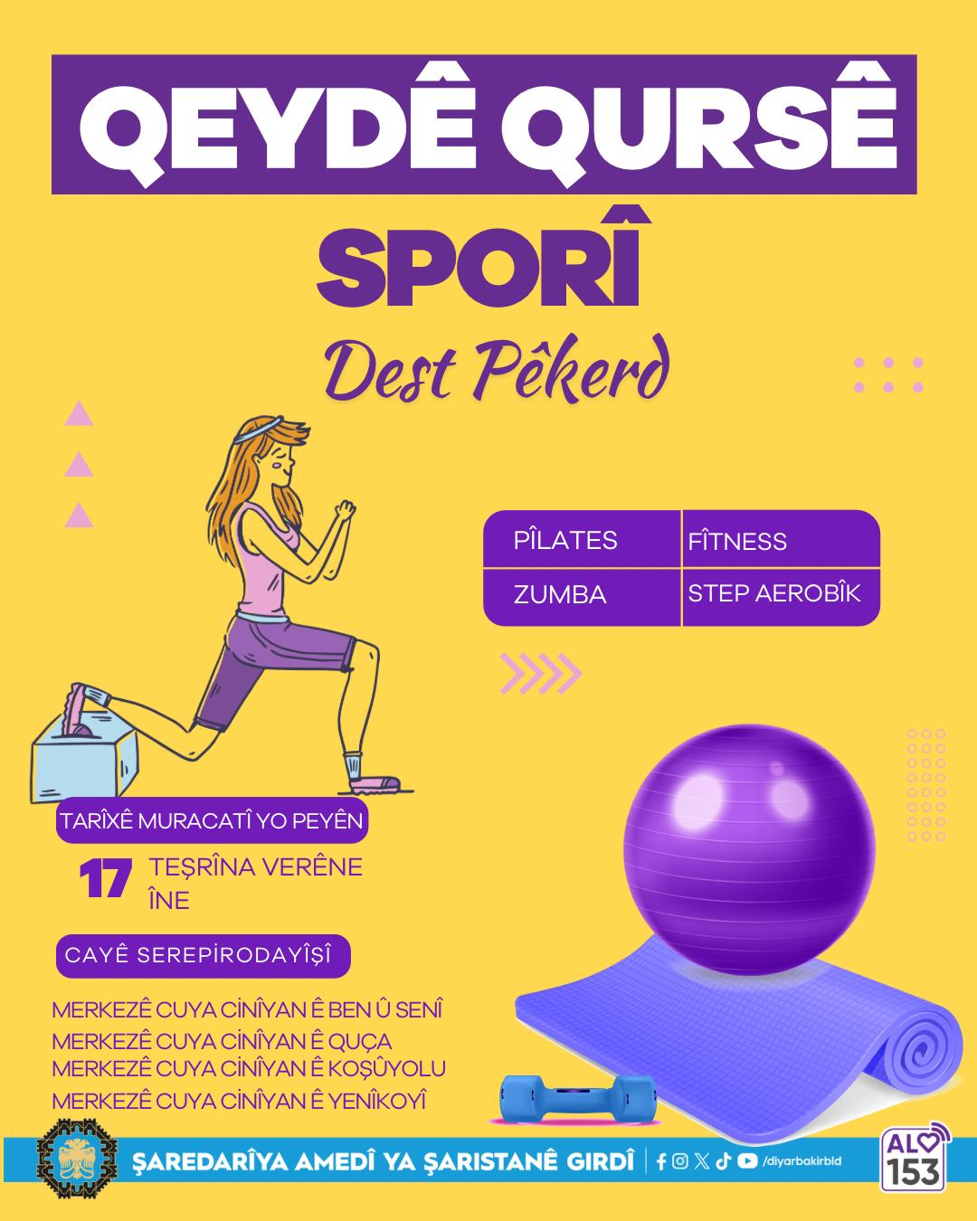 Kesên ku dixwazin tevlî kursên sporê bibin, dikarin heta roja Înê, 17'ê Cotmehê, li ser Navendên Jiyanê yên Jinan ên Ben û Sen, Qûçan, Koşuyolu û Yenîkoyê serlêdanê bikin.
