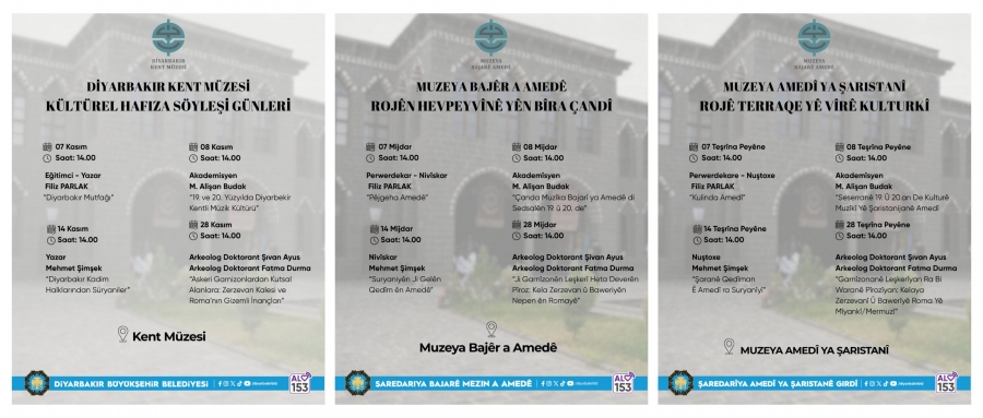 Şaredariya Bajarê Mezin a Amedê, li Muzexaneya Bajêr a Qesra Cemîlpaşa, dê di meha Mijdarê de bi beşdariya akademîsyen, perwerdekar, nivîskar û arkeologan, gotûbêjên bîra çandî bi sernavên cuda organîze bike.