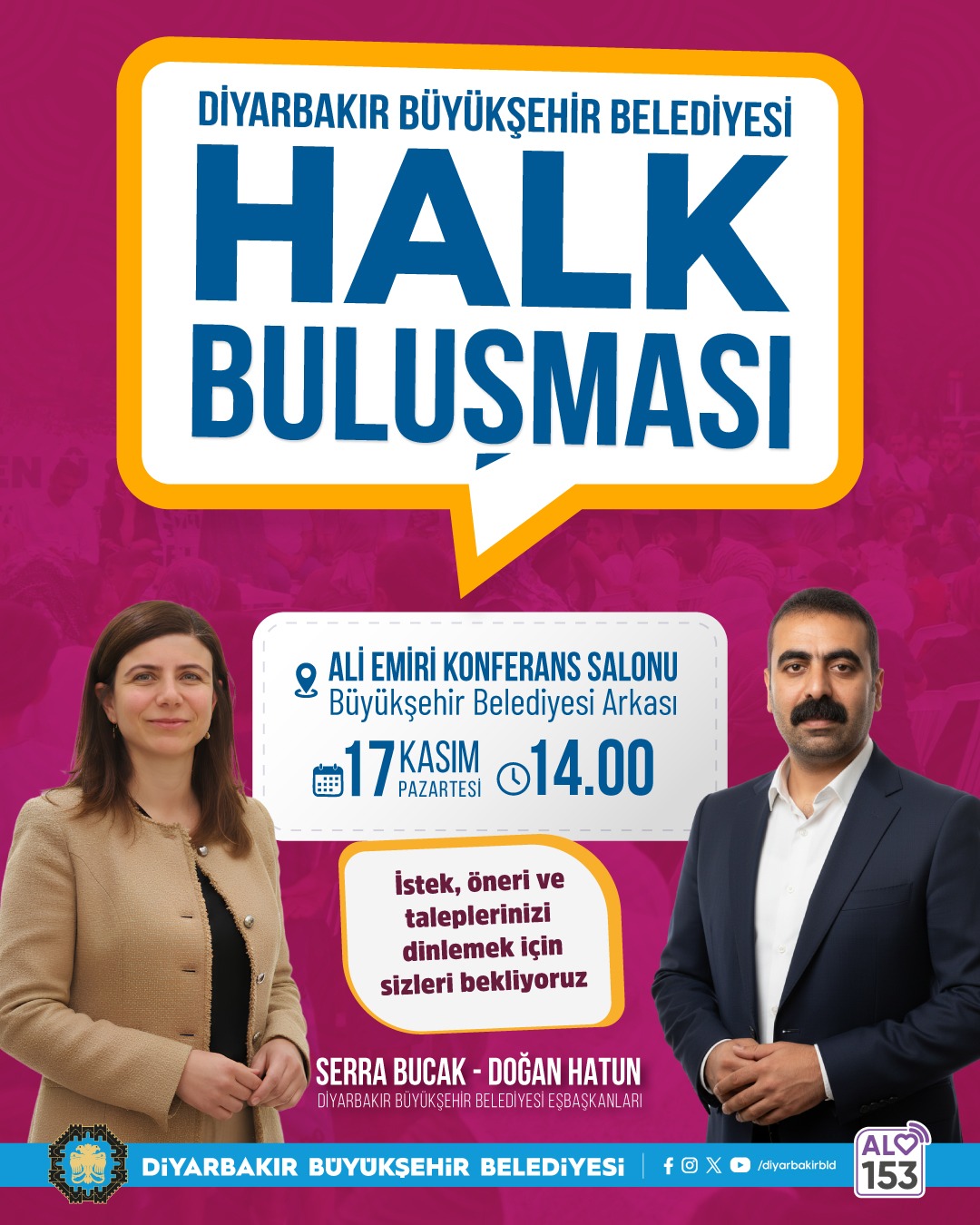 Hevşaredarên Şaredariya Bajarê Mezin a Amedê Serra Bucak û Dogan Hatun, di çarçoveya “Hevdîtina Bi Gel Re” dê di 17ê Mijdarê de bi welatiyan re bicivin.