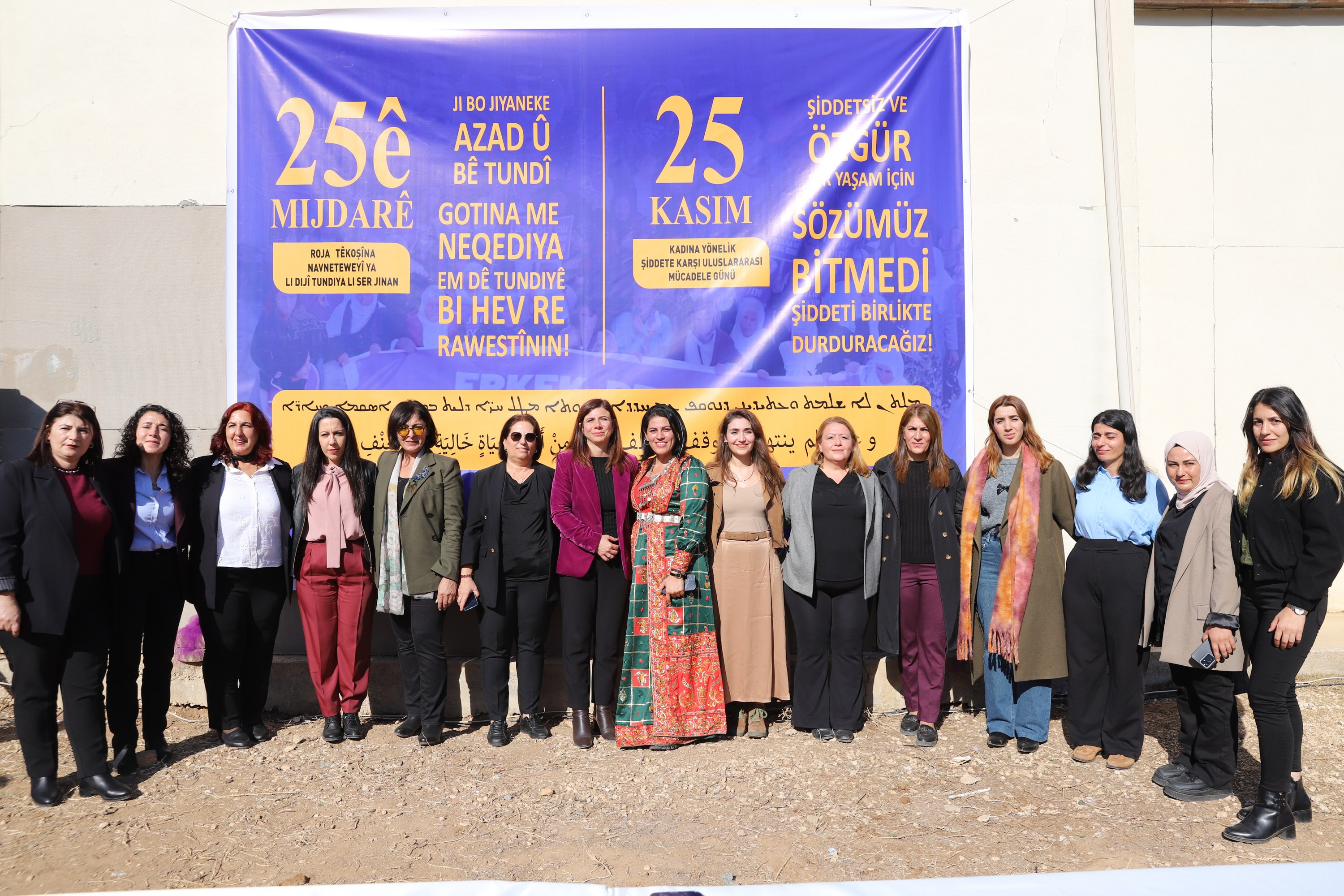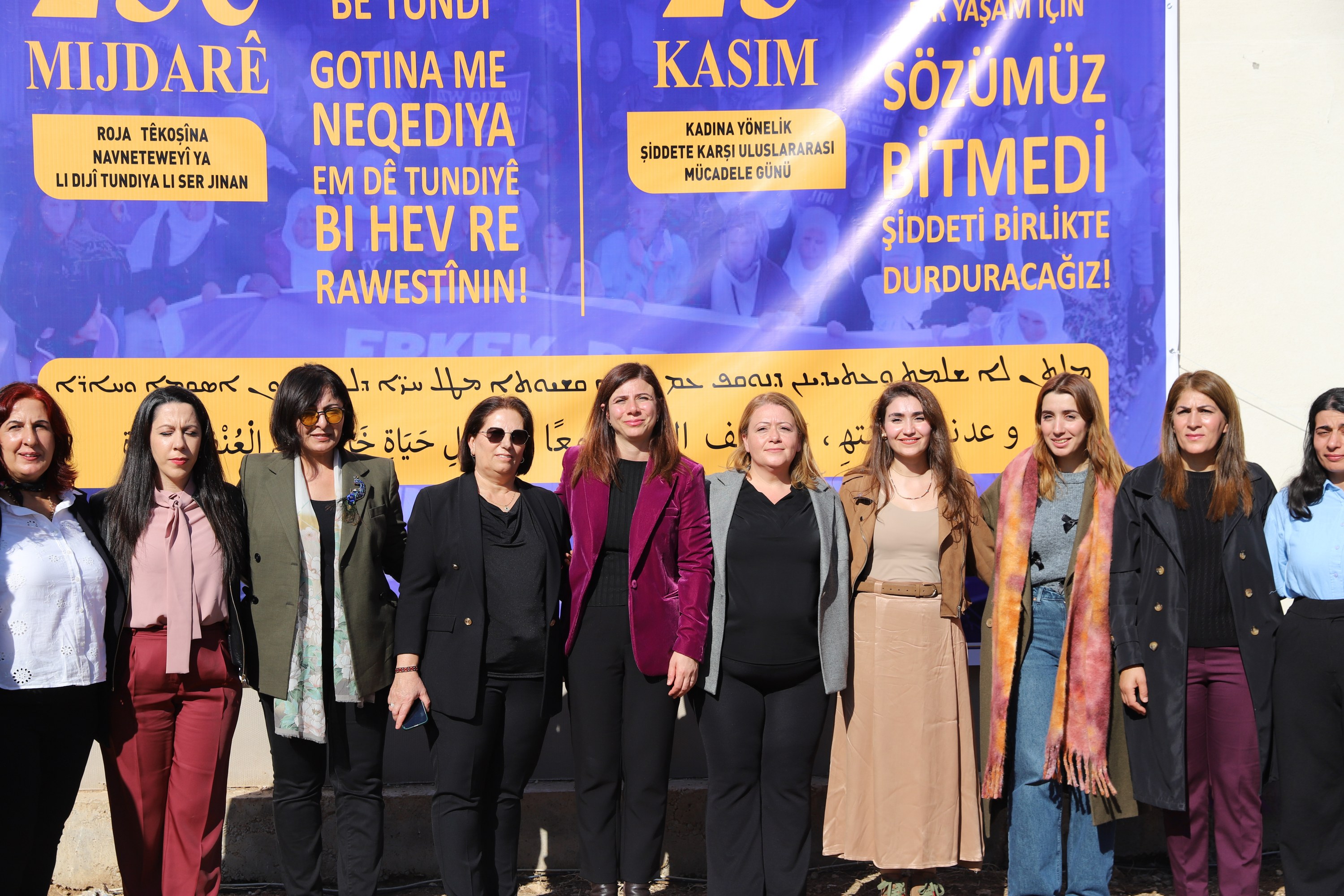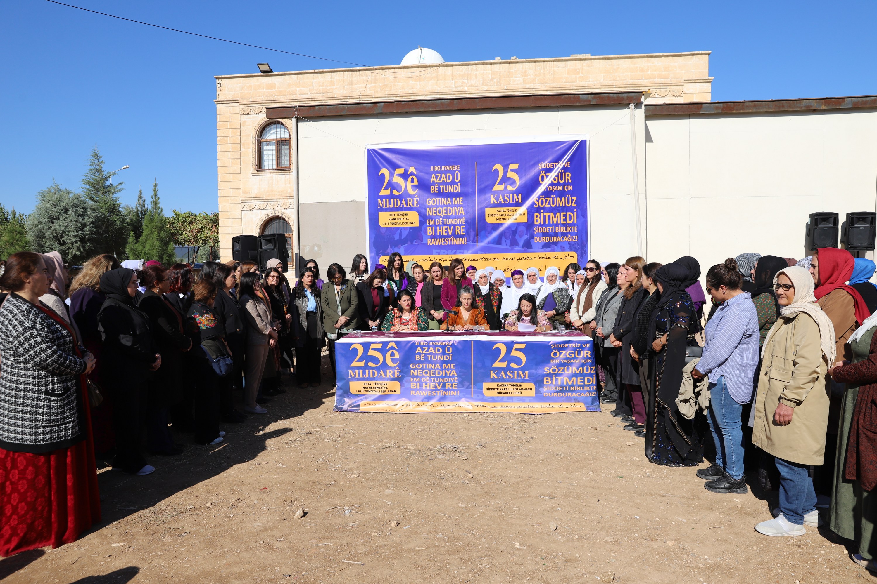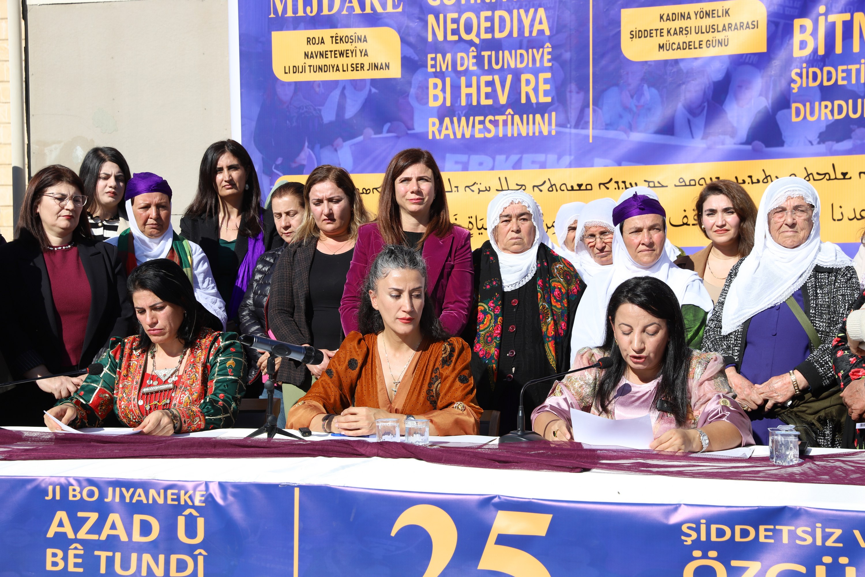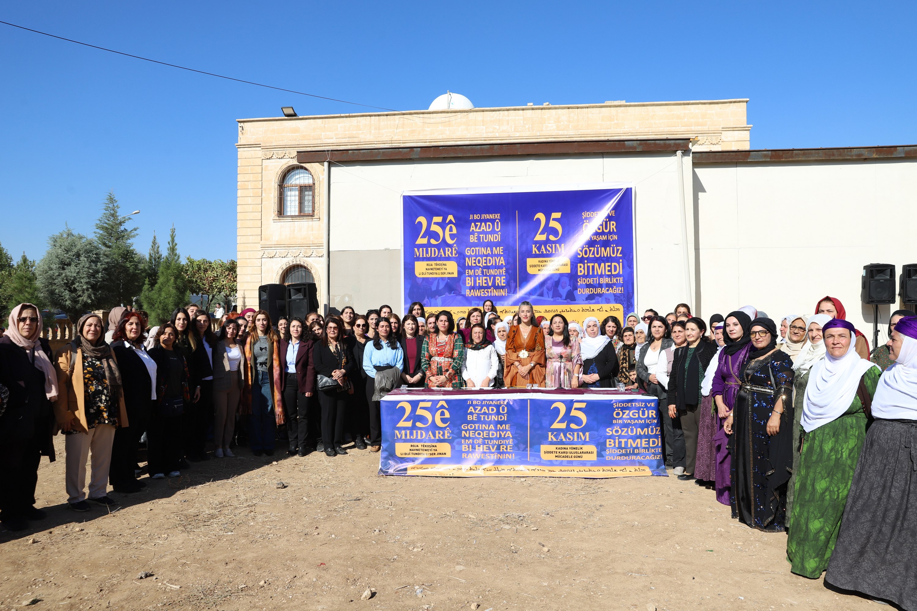 Şaredariyên Partiya Wekhevî û Demokrasiyê ya Gelan (DEM Partî), têkildarî kampanyaya “Ji bo Jiyaneke Bêşîdet û Azad Gotina Me Neqediyaye, Em ê Şîdetê bi Hev re Rawestînin” a ku par bi boneya 25ê Mijdarê Roja Têkoşîna Navneteweyî ya Dijî Şîdeta li Ser Jinan hatibû destpêkirin, deklarasyonek aşkere kir. Hevşaredara Bajarê Mezin a Amedê Serra Bucak, hevşaredarên jin ên şaredariyan û gelek jin beşdarî daxuyaniya ku li Navenda Jiyan û Hevgirtina Jinan a Navjîn a navçeya Nisêbîna Mêrdînê hat lidarxistin, bûn.