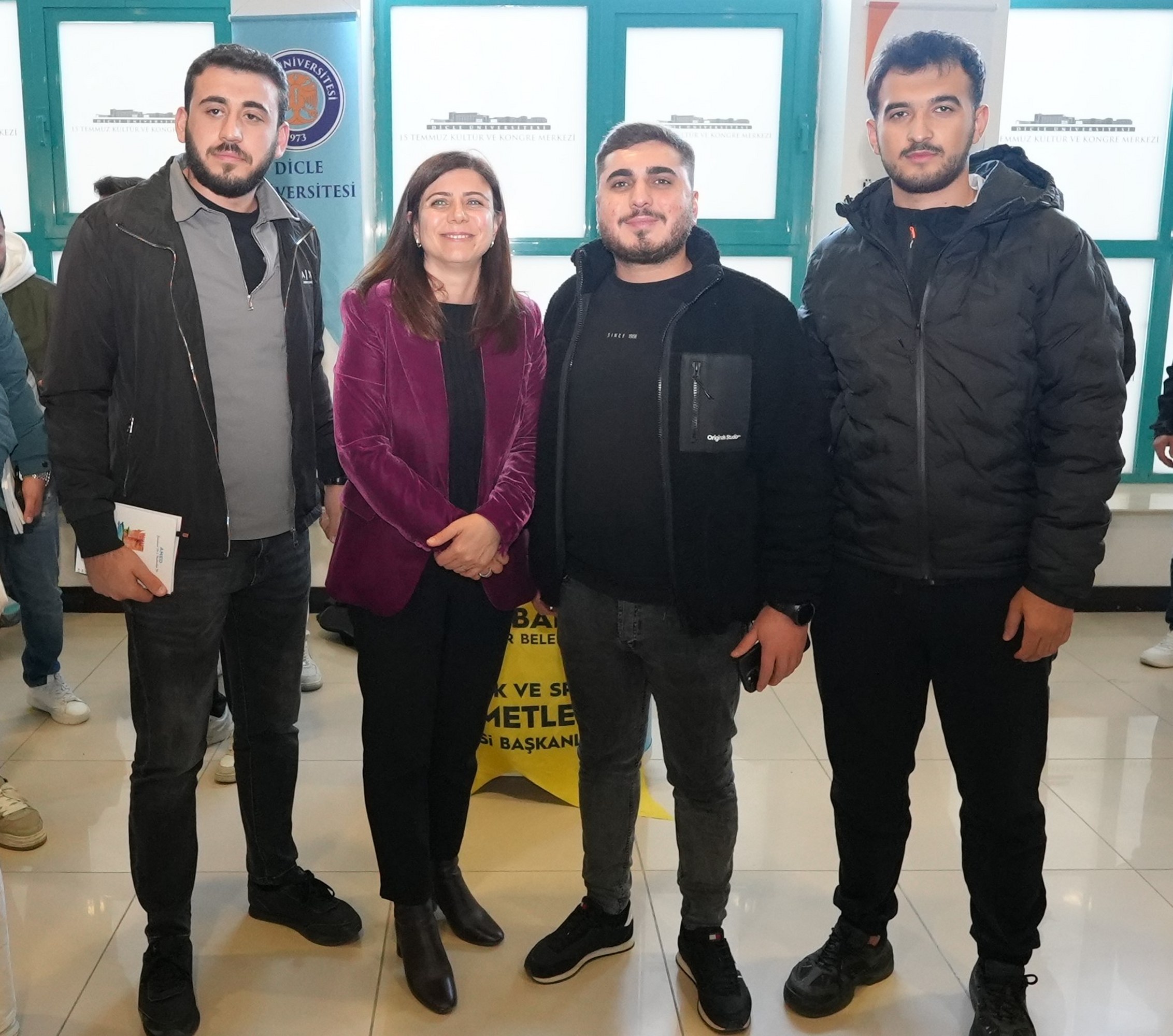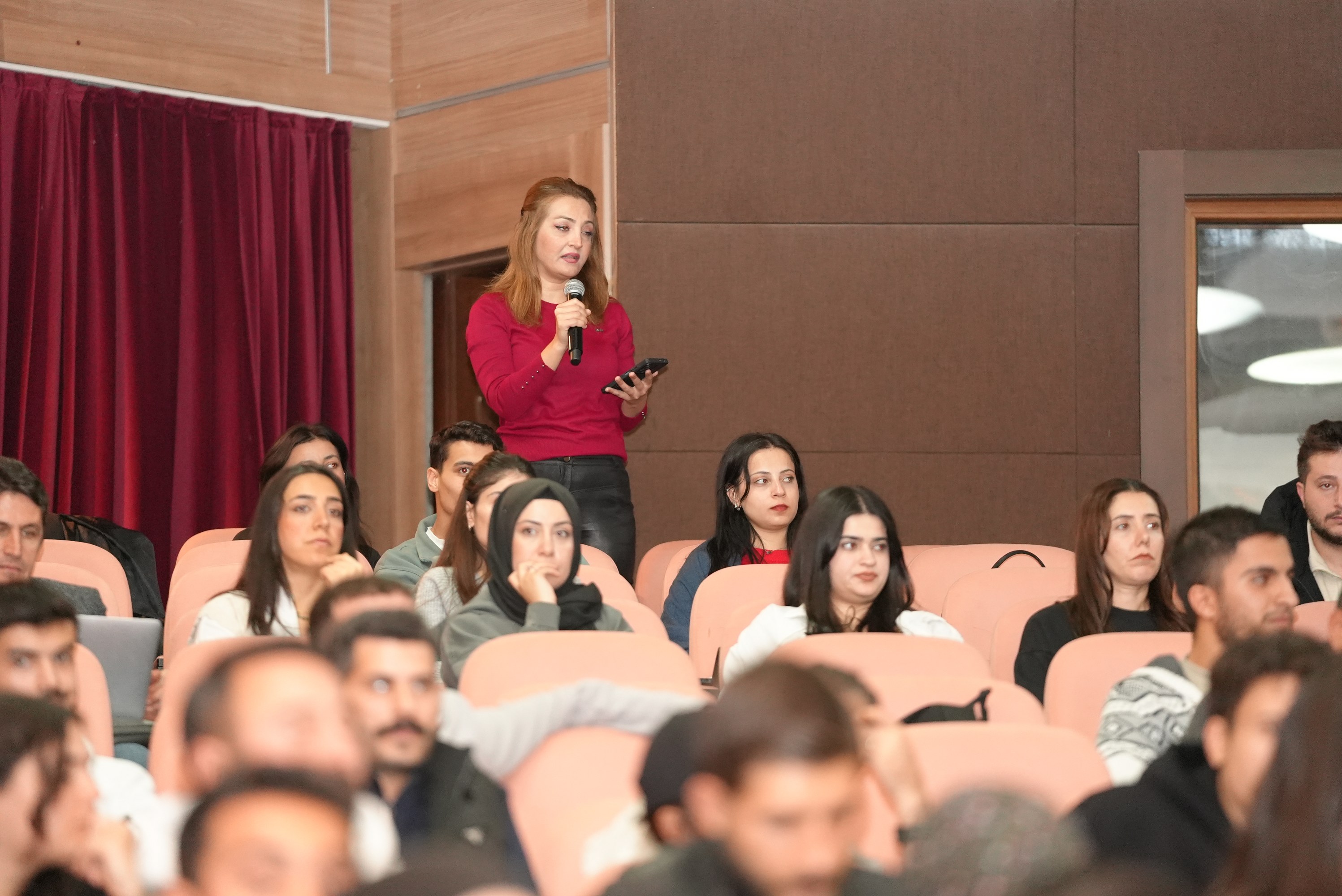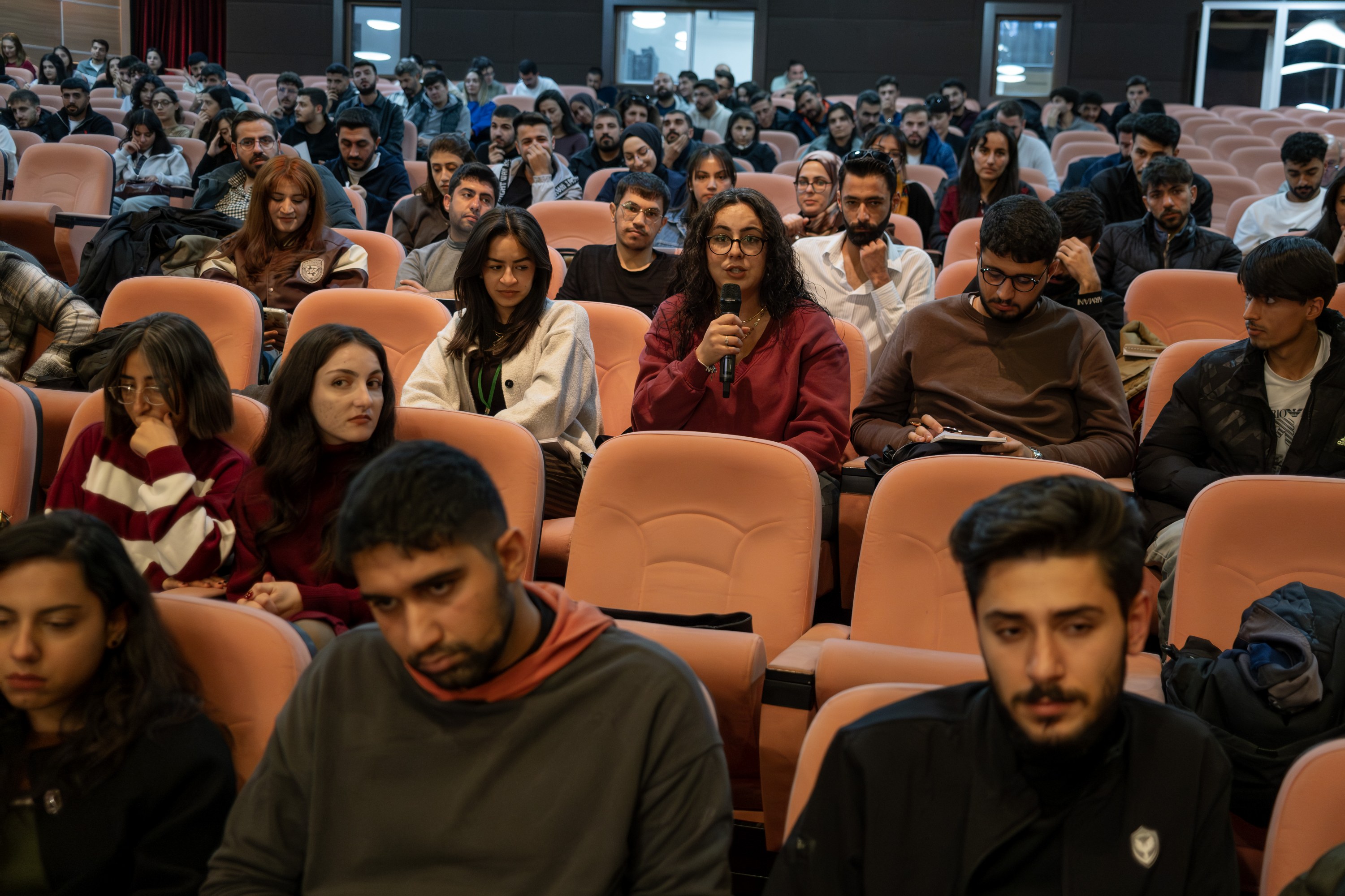 Hevşaredarên Şaredariya Bajarê Mezin a Amedê Serra Bucak û Dogan Hatun, di civînekê de bi ciwanên zanîngehê re pirsên li ser rêveberiya herêmî, veguhastin, ekolojî, xebatên ziman û beşdarbûna demokratîk bersivandin.