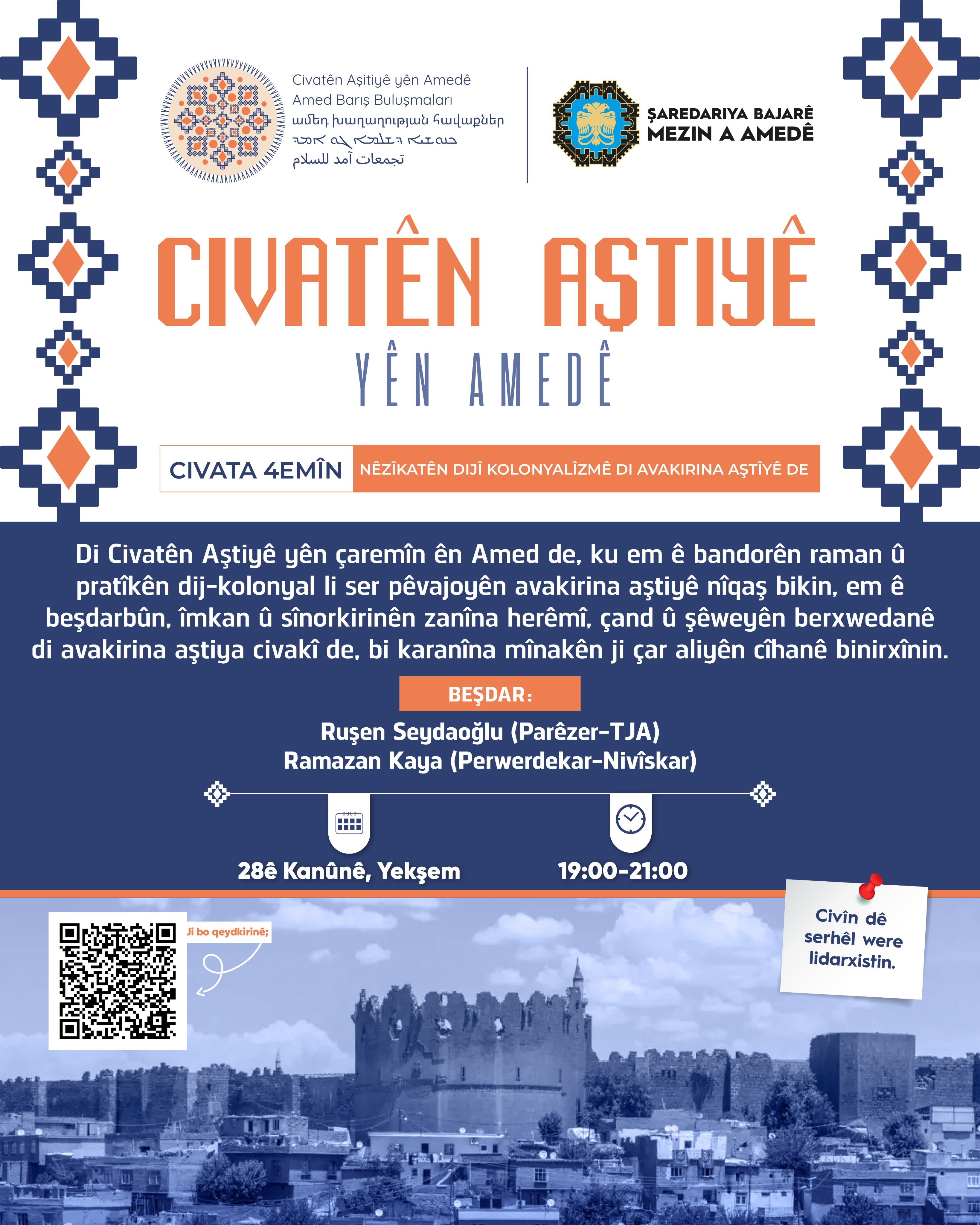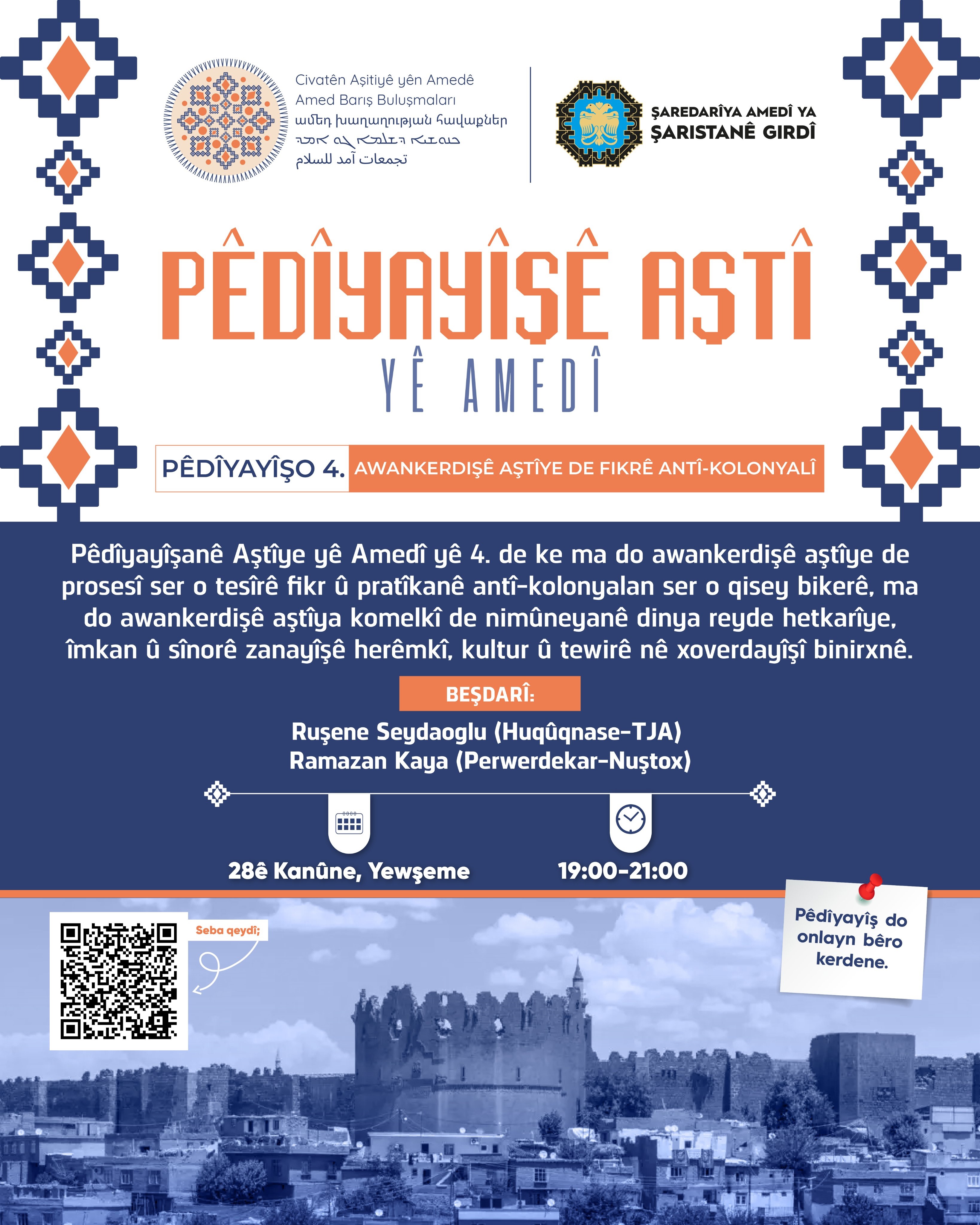 Rûniştina çarem a bernameya "Civatên Aştiyê ya Amedê" ku ji aliyê Şaredariya Bajarê Mezin a Amedê ve tê birêvebirin, bi sernavê “Di Avakirina Aştiyê de Nêzîkatiyên Antî-Kolonyal” di 28ê Kanûnê de bê lidarxistin.