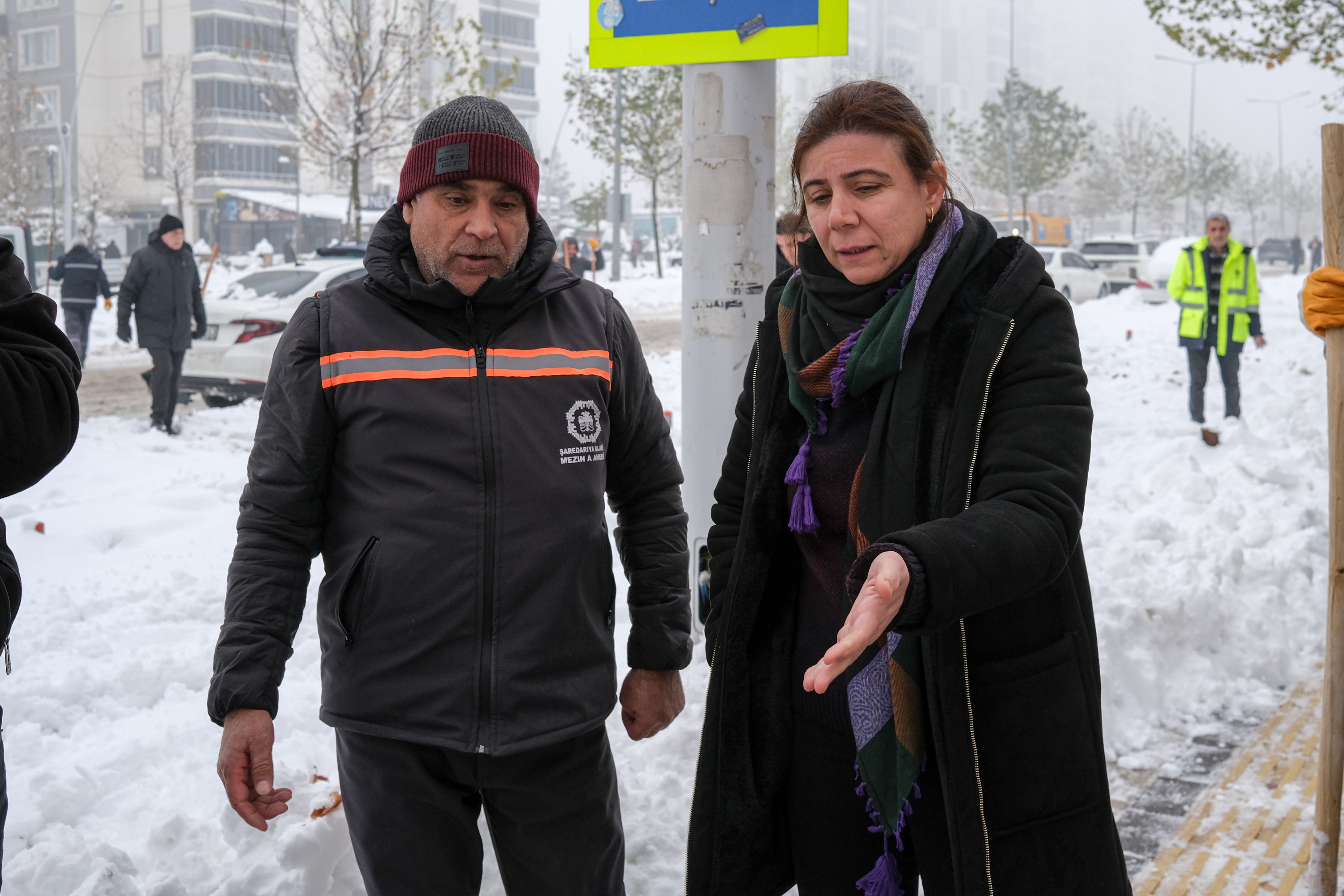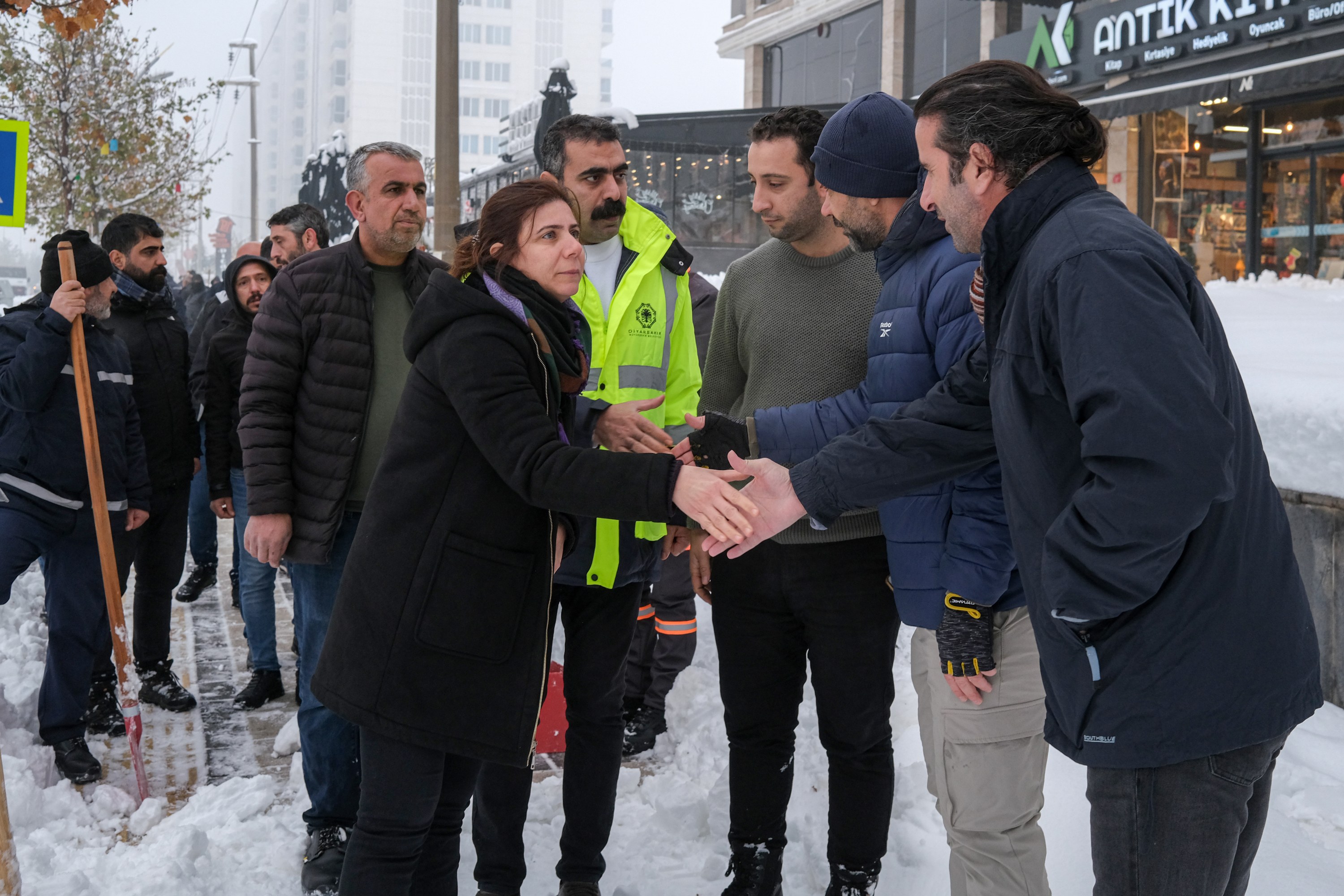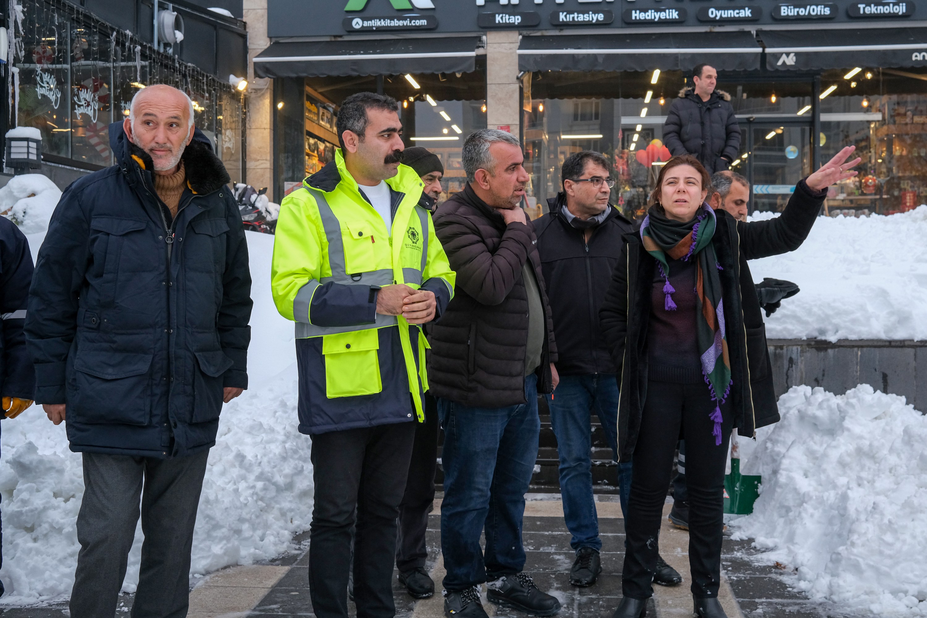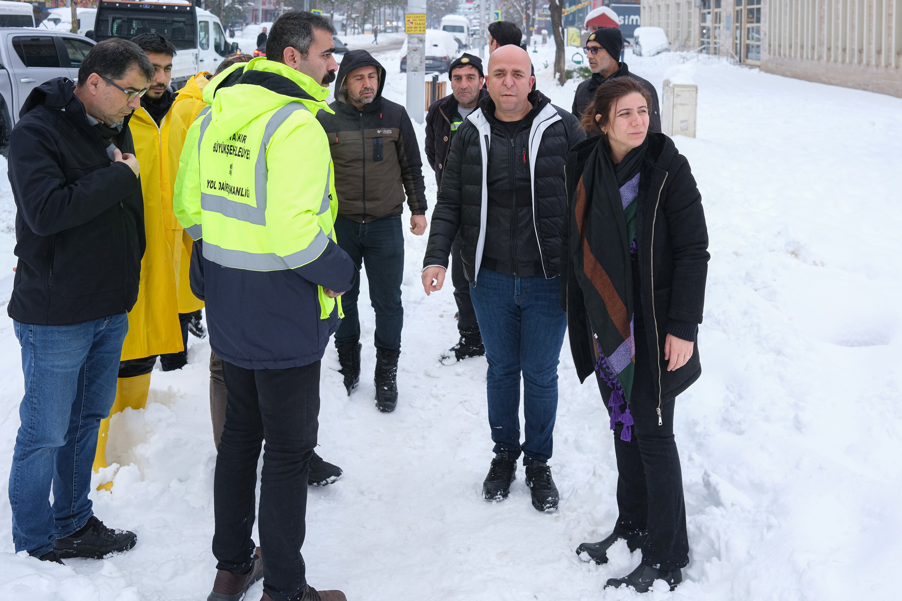 Hevşaredarên Şaredariya Bajarê Mezin a Amedê Serra Bucak û Dogan Hatun, xebatên ku li dijî barîna berfê tên meşandin koordîne kirin û xebatên li seranserê bajêr di cih de lêkolîn kirin.