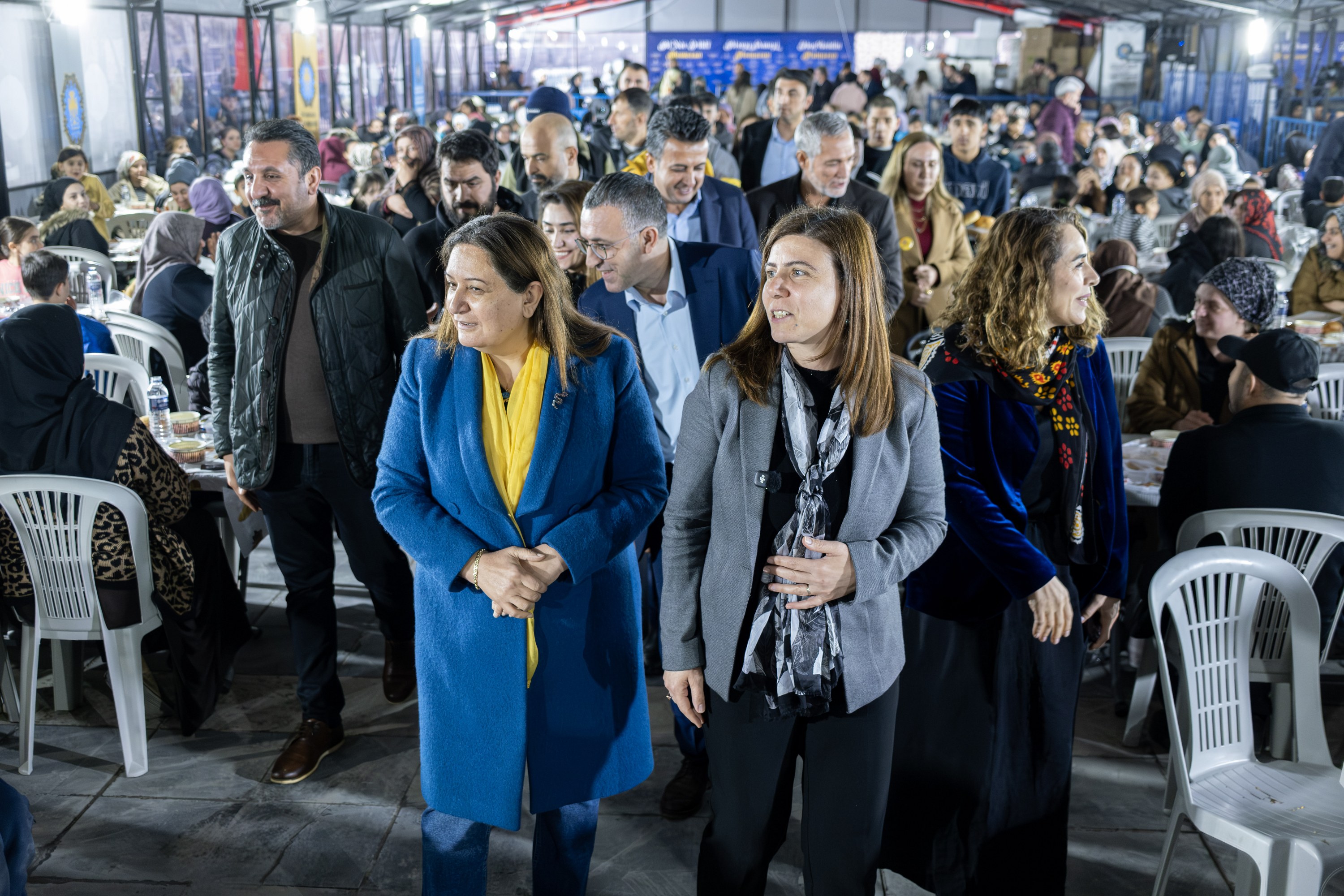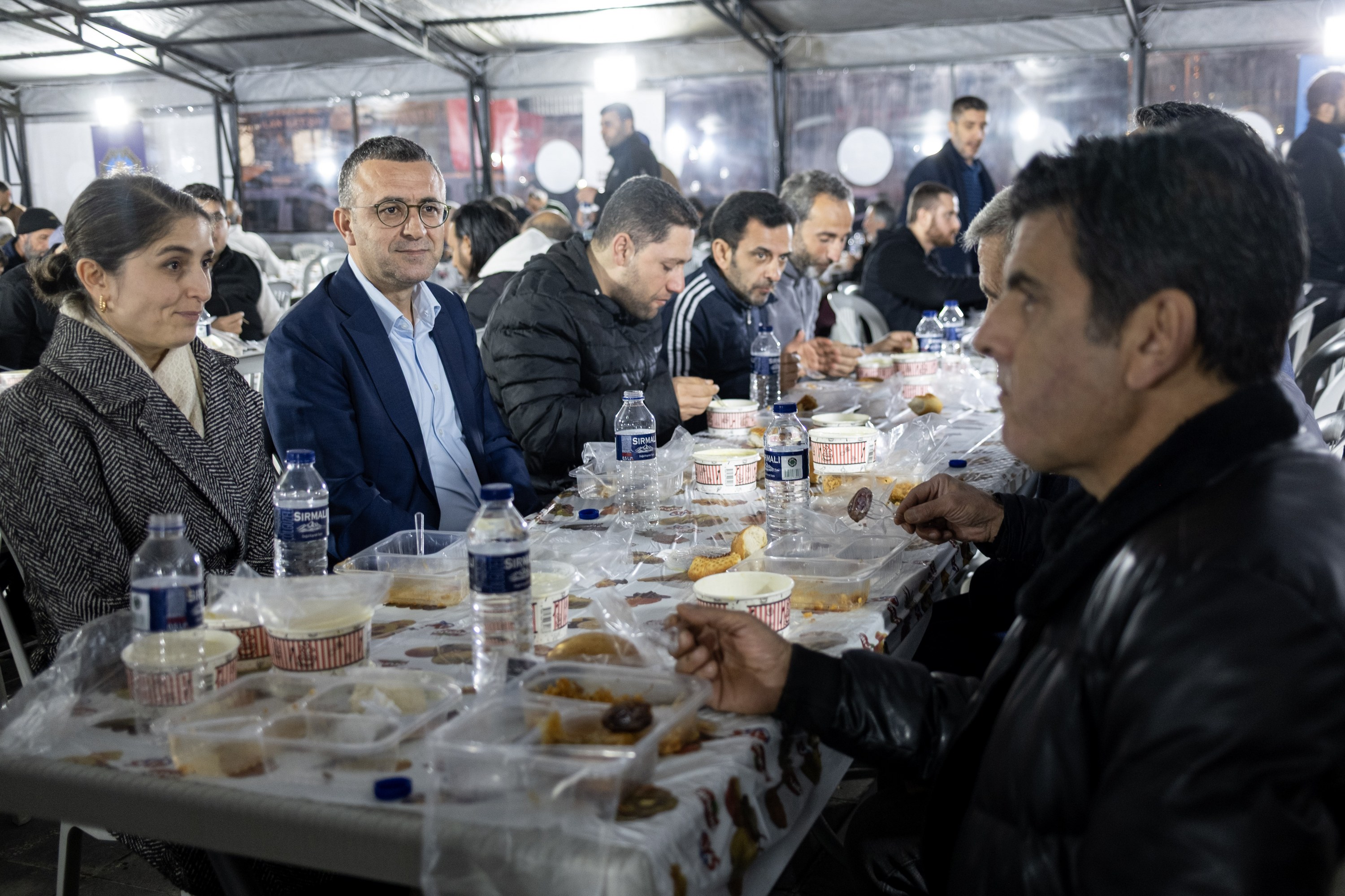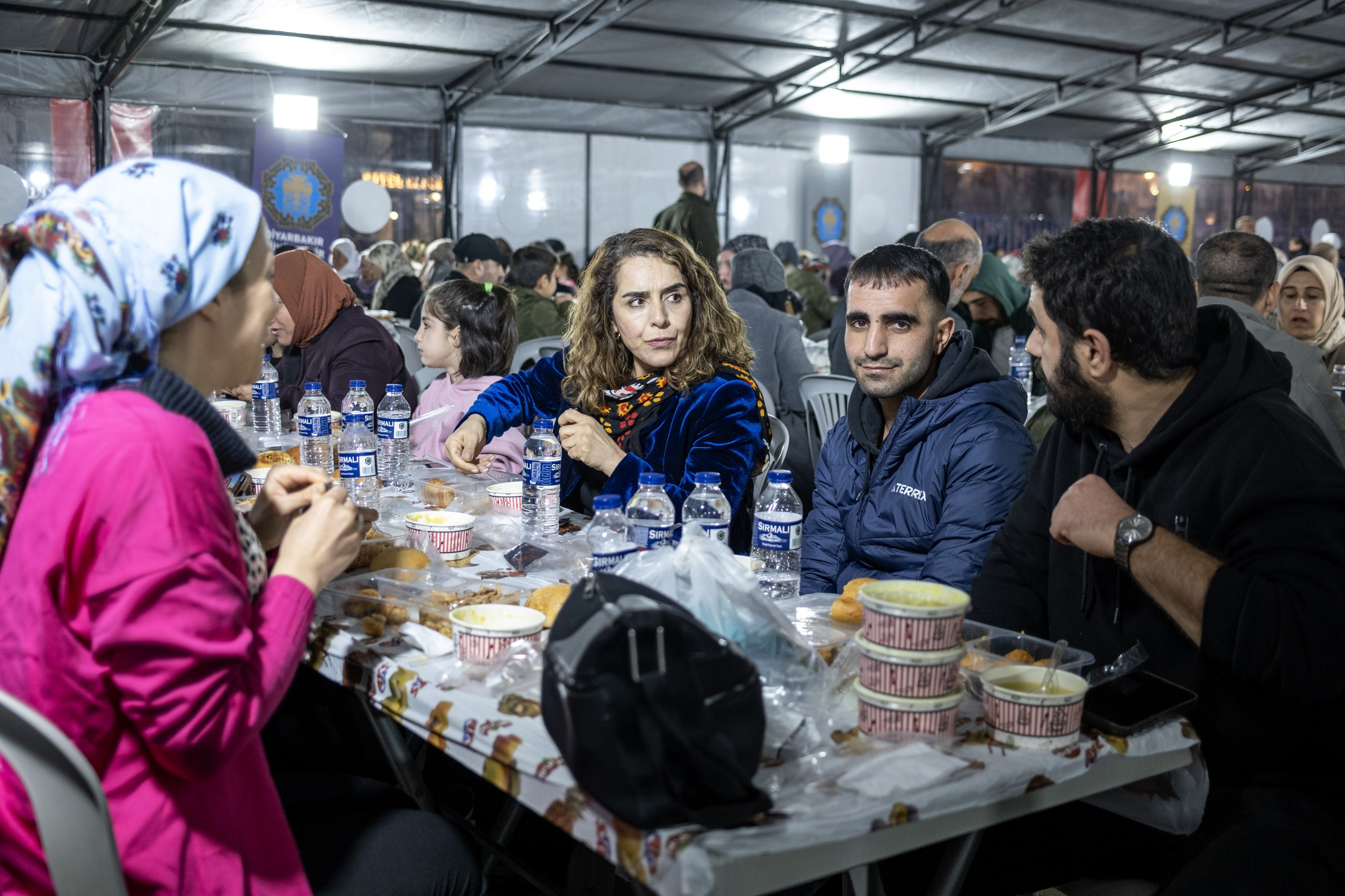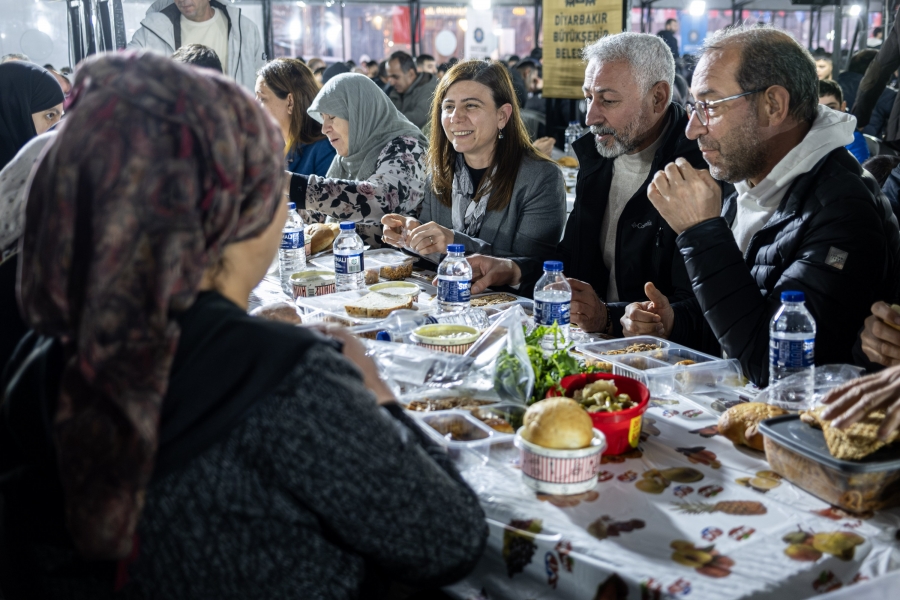 Hevşaredara Bajarê Mezin Serra Bucak; ligel Hevberdevkên Meclîsa DBB’ê Demet Ceylan û Ayhan Karatekin, Hevşaredarên Sûrê Fatma Gulan Onkol û Adnan Orhan, parlamenterên Partiya Wekhevî û Demokrasiyê ya Gelan (DEM Parti) Ceylan Akça, Adalet Kaya û Serhat Eren, Hevseroka DEM Partiyê ya Bajêr Gulşen Ozer û Hevserokê Partiya Herêmên Demokratîk (DBP) ê Bajêr Ahmet Dogan, serdana konê fitarê yê li Meydana Deriyê Çiyê kirin û bi welatiyan re hatin cem hev.