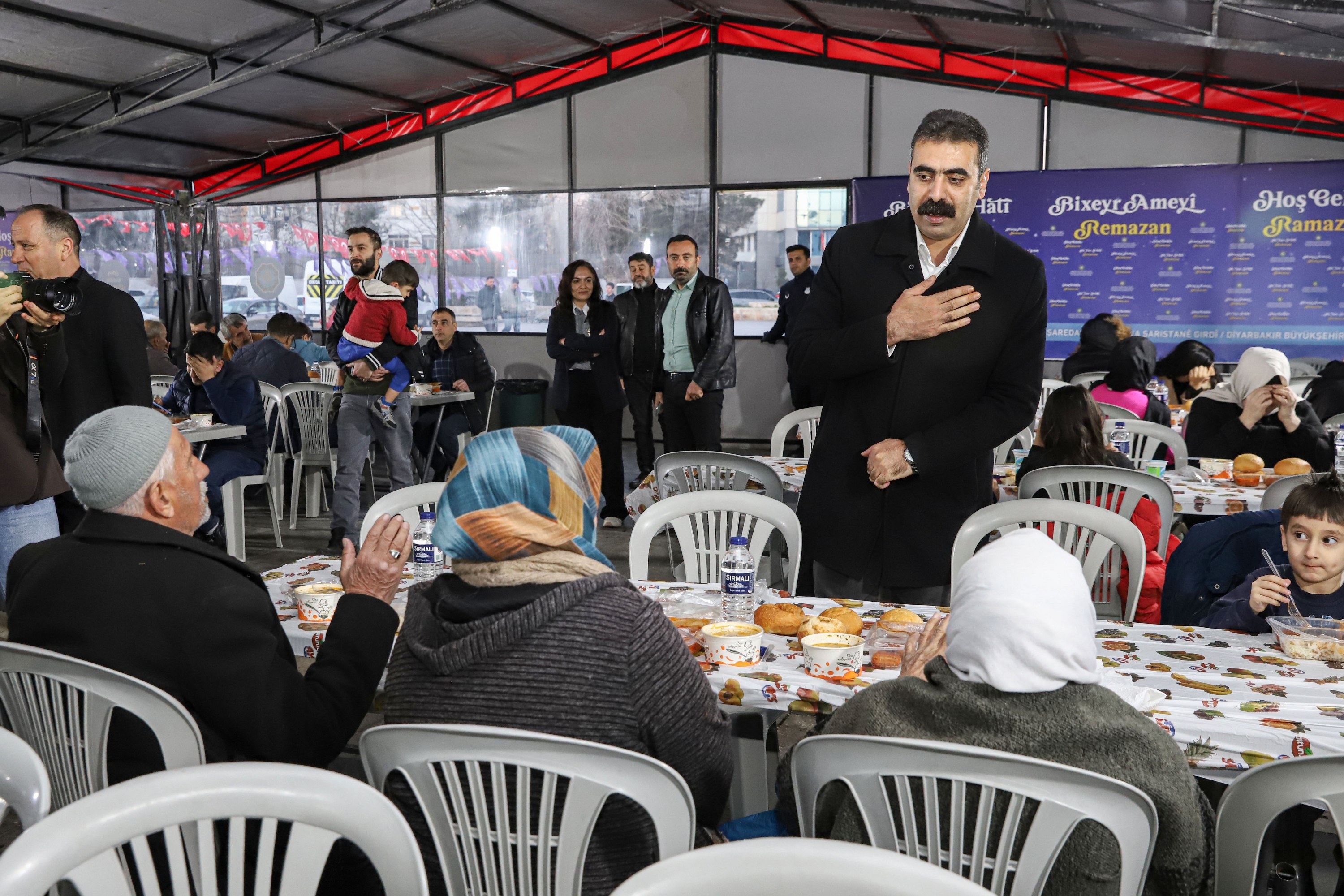 Hevşaredarên Şaredariya Bajarê Mezin a Amedê Serra Bucak û Dogan Hatun, ji ber meha Remezanê li konên fitarê yên ku li Meydana Deriyê Çiyê û li navçeya Rezanê (Baxlar) li Parka Mala Tenûrê hatine vegirtin, bi welatiyan re fitara xwe kirin.