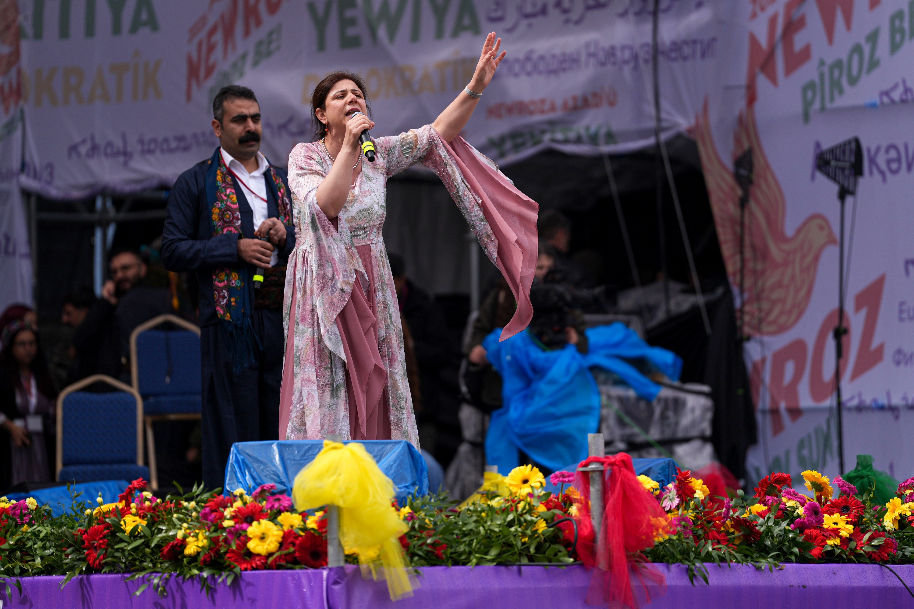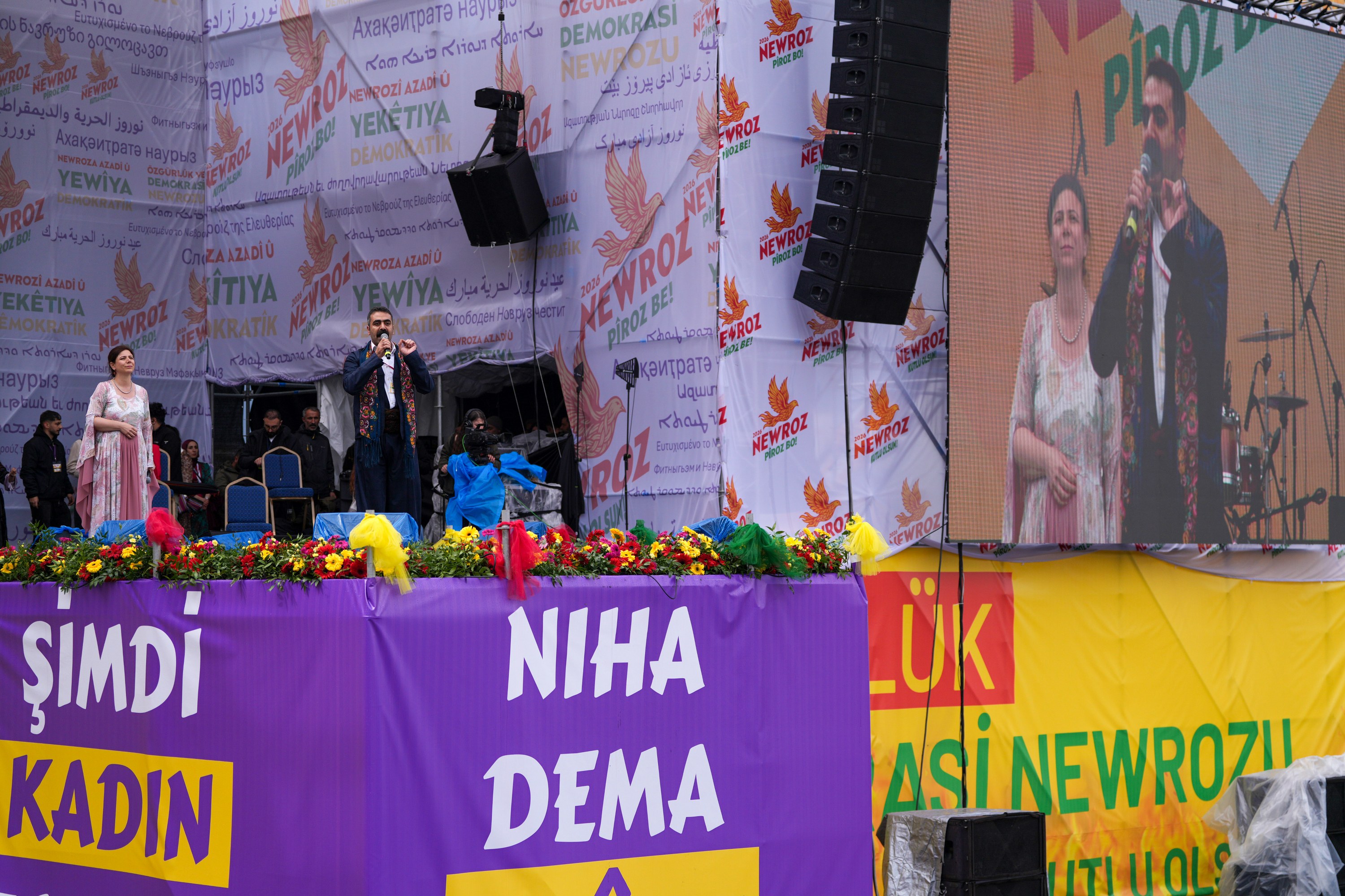 "Cejn û Newroza we ya Amedê pîroz be, hûn bi xêr hatin. Amed! Hûn îro ne tenê Amed in. Hûn îro Hewlêr, Silêmanî û Mehabad in; hûn îro Efrîn in. Dengê Efrînê îro ji we bilind dibe. Newroza Efrînê pîroz be. Newroza Hewlêrê pîroz be, Newroza Mehabadê pîroz be. Îro Newroza azadiyê ye, hemû bajar îro li Amedê ne. Mêvanên me yên pir hêja îro li Amedê ne. Hûn hemû bi xêr hatin. Dengê azadiyê ji kolanên Amedê bilind dibe. Guhê cîhanê li vir e, dengê xwe bilind bikin. Newroza gelê Kurd pîroz be, hûn li ser seran û ser çavan hatin."