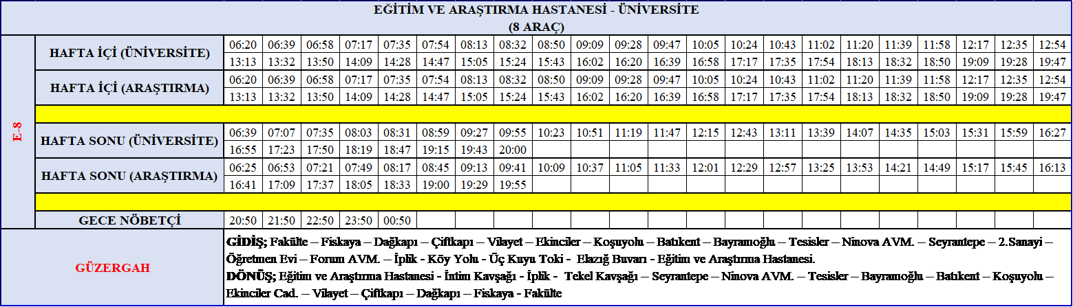 E8 hat kodlu aracımız ulaşım hizmeti sağlarken Köy Yolu ve Üçkuyu tokiye girmez iken yeni güzergahımızda Köy Yolu ve Üç Kuyu Toki Bölgesine de hizmet sağlanacaktır. Yeni Güzergah: Fakülte – Fiskaya – Dağkapı – Çiftkapı – Vilayet – Ekinciler – Koşuyolu – Batıkent – Bayramoğlu – Tesisler – Ninova AVM. – Seyrantepe – 2.Sanayi – Öğretmen Evi – Forum AVM. – İplik - Köy Yolu - Üç Kuyu Toki - Elazığ Buvarı - Eğitim ve Araştırma Hastanesi.