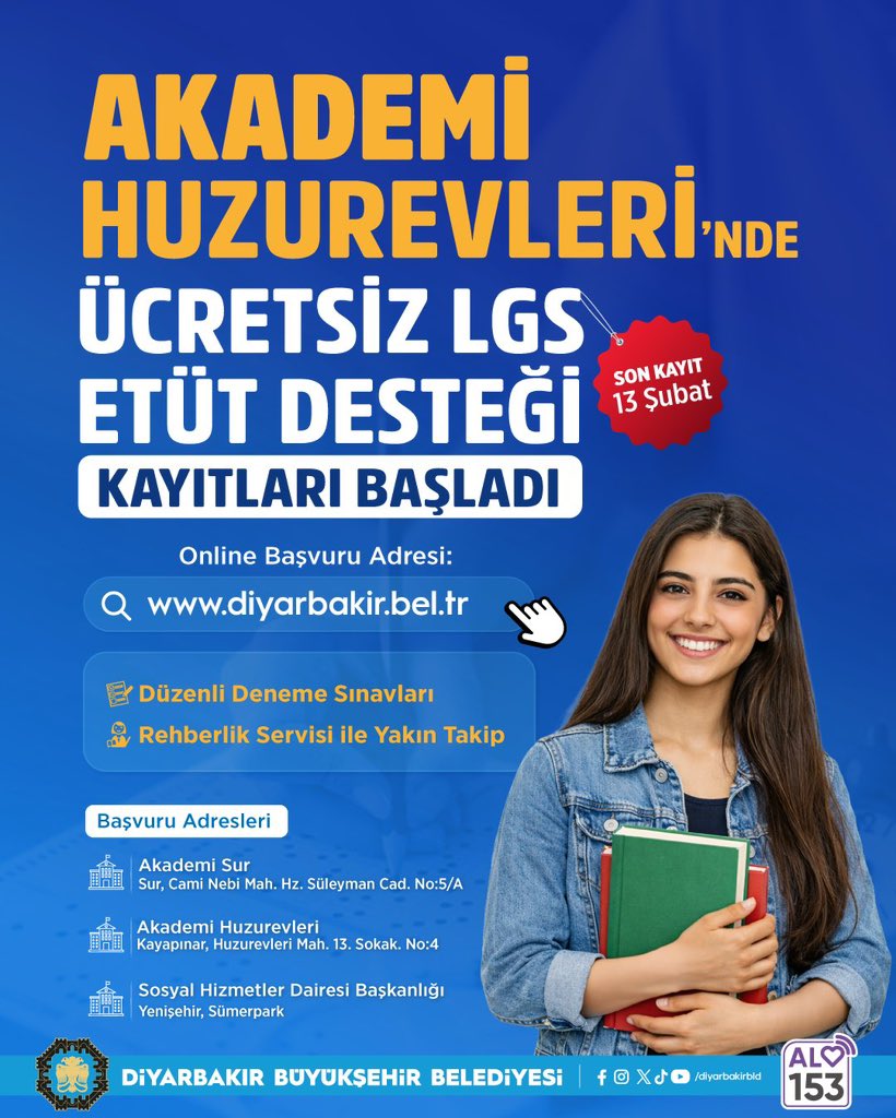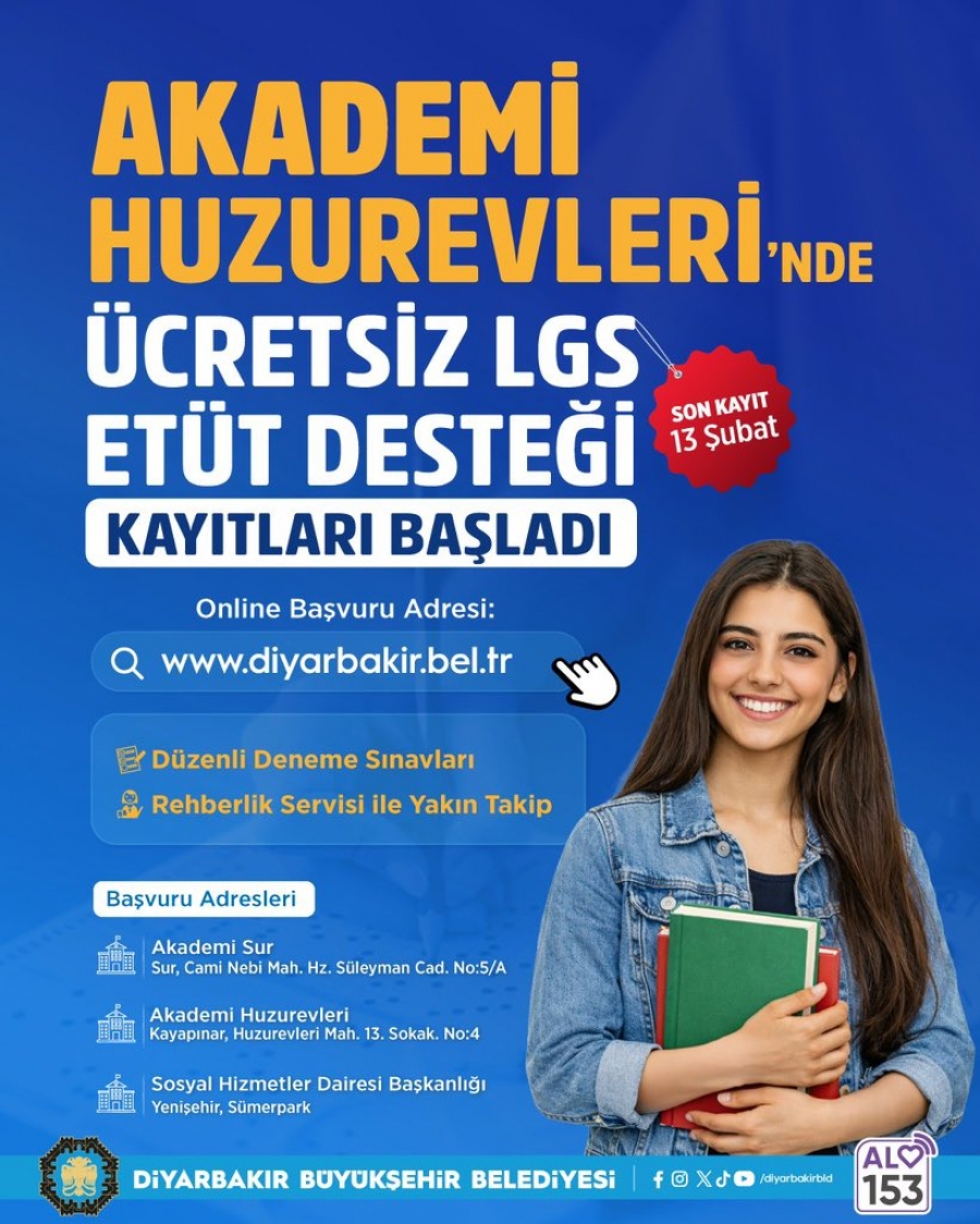 Başvurular https://diyarbakir.bel.tr/lgs-basvuru adresi üzerinden online ve Akademi Sur, Akademi Huzurevleri ile Sümerpark yerleşkesinde bulunan Sosyal Hizmetler Dairesi Başkanlığı’nda yapılabilecek.