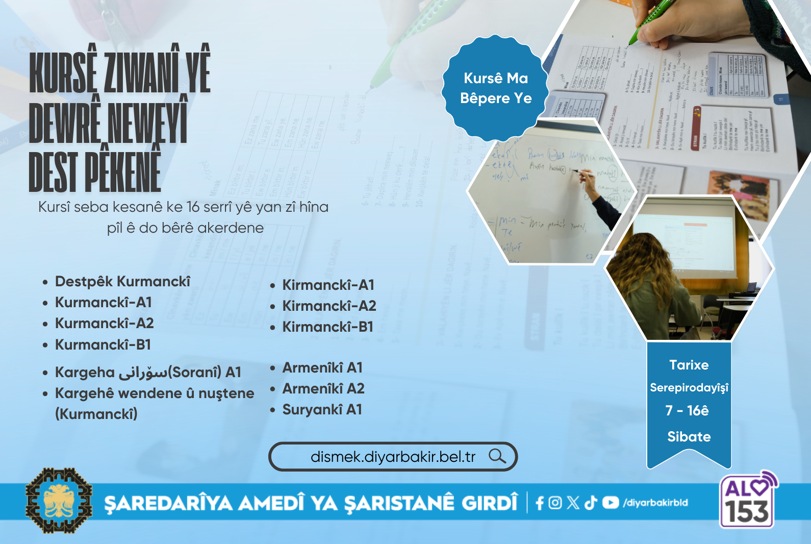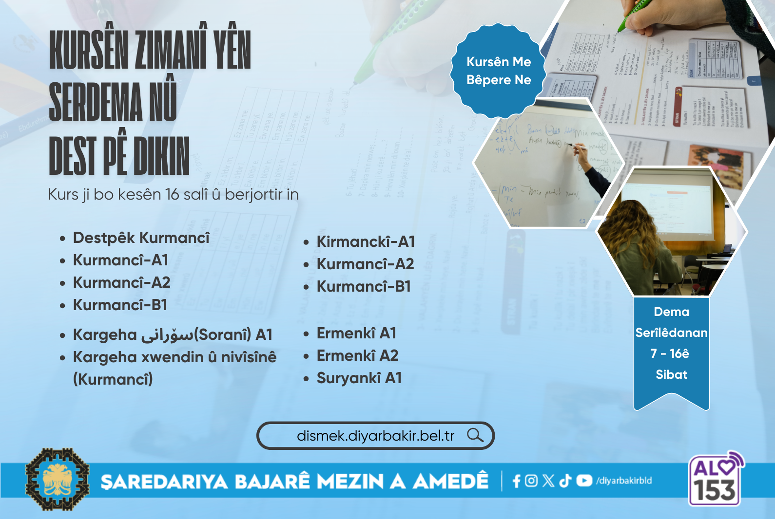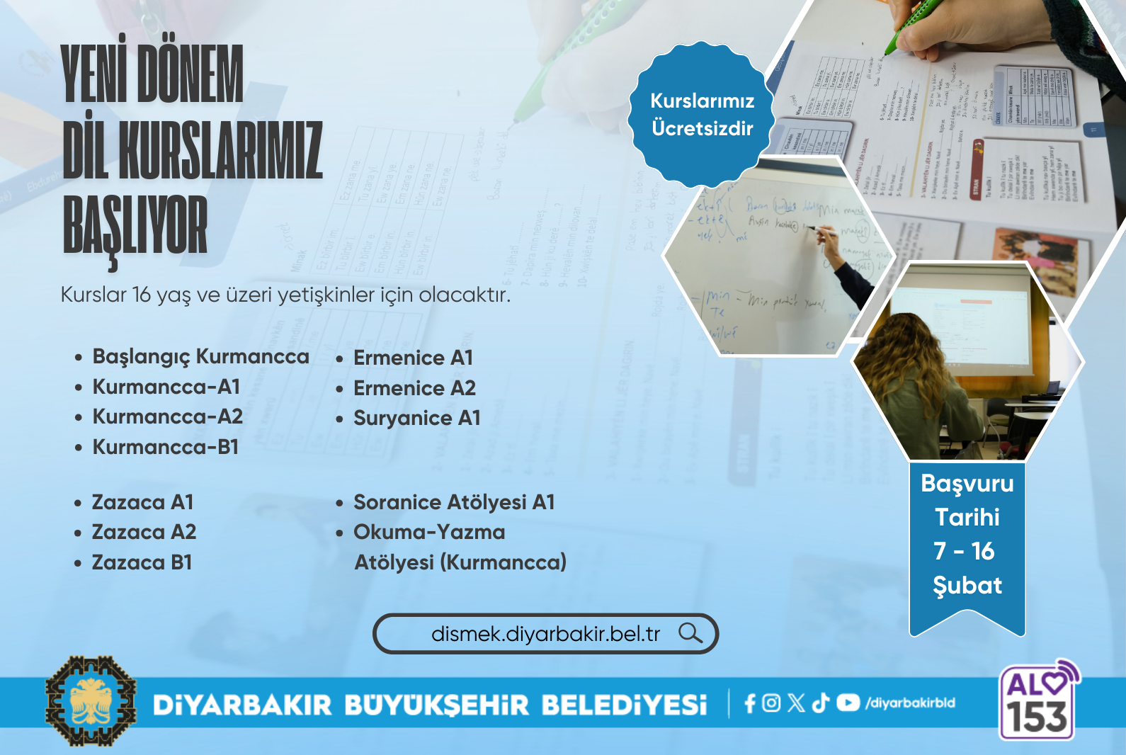 Diyarbakır Büyükşehir Belediyesi, yeni dönem dil kursları için 7–16 Şubat tarihleri arasında başvuru alacak.