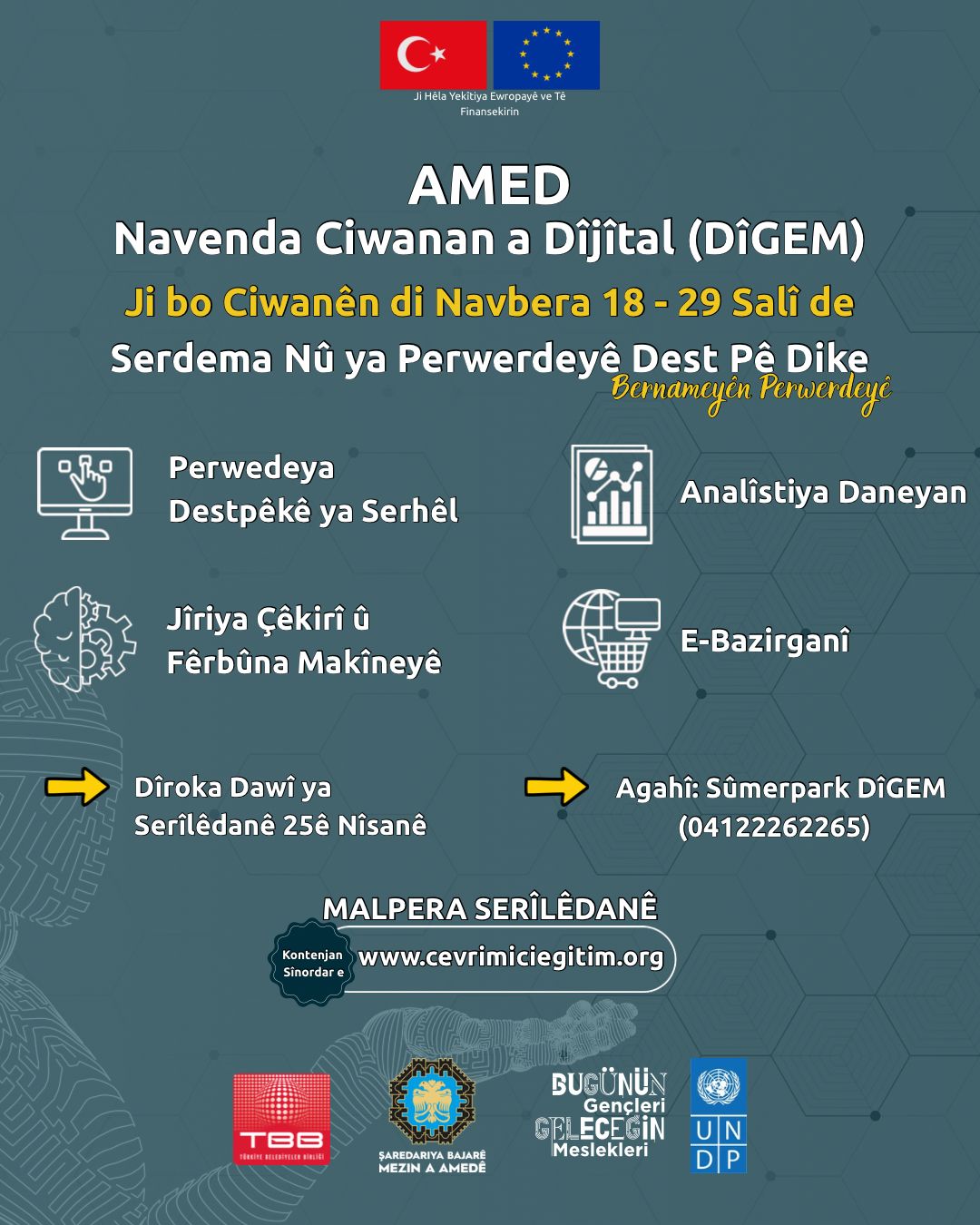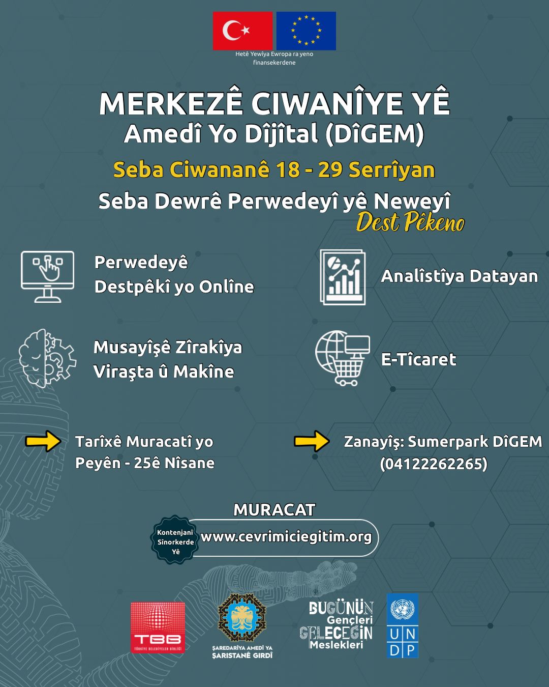 Diyarbakır Büyükşehir Belediyesi, Avrupa Birliği finansmanı, Birleşmiş Milletler Kalkınma Programı (UNDP) ve Türkiye Belediyeler Birliği (TBB) iş birliğiyle hayata geçirilen “Bugünün Gençleri Geleceğin Meslekleri” projesiyle gençleri dijital çağın ihtiyaç duyduğu alanlarla buluşturuyor. Dijital Gençlik Merkezi’nde (DİGEM) yürütülecek program kapsamında 18-29 yaş arası çalışmayan gençler; e-ticaret, veri analistliği, yapay zekâ, online bilgisayar gibi stratejik alanlarda eğitim alarak hem meslek edinecek hem de iş hayatına daha güçlü ve donanımlı bir başlangıç yapacak.