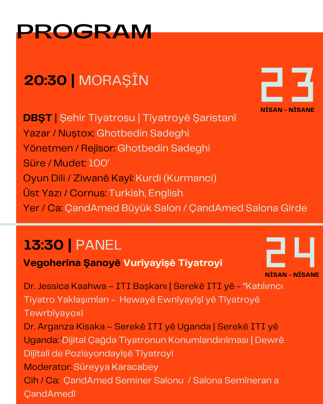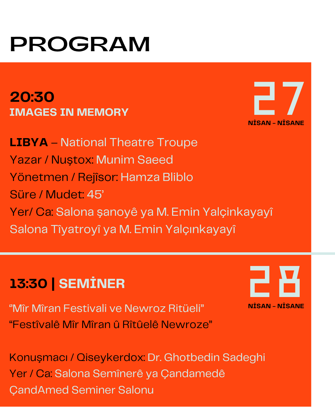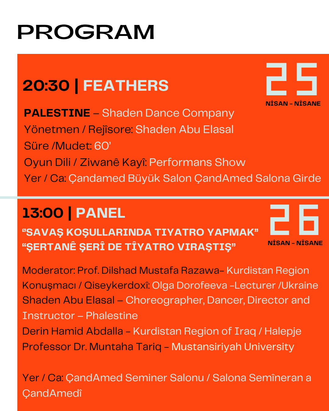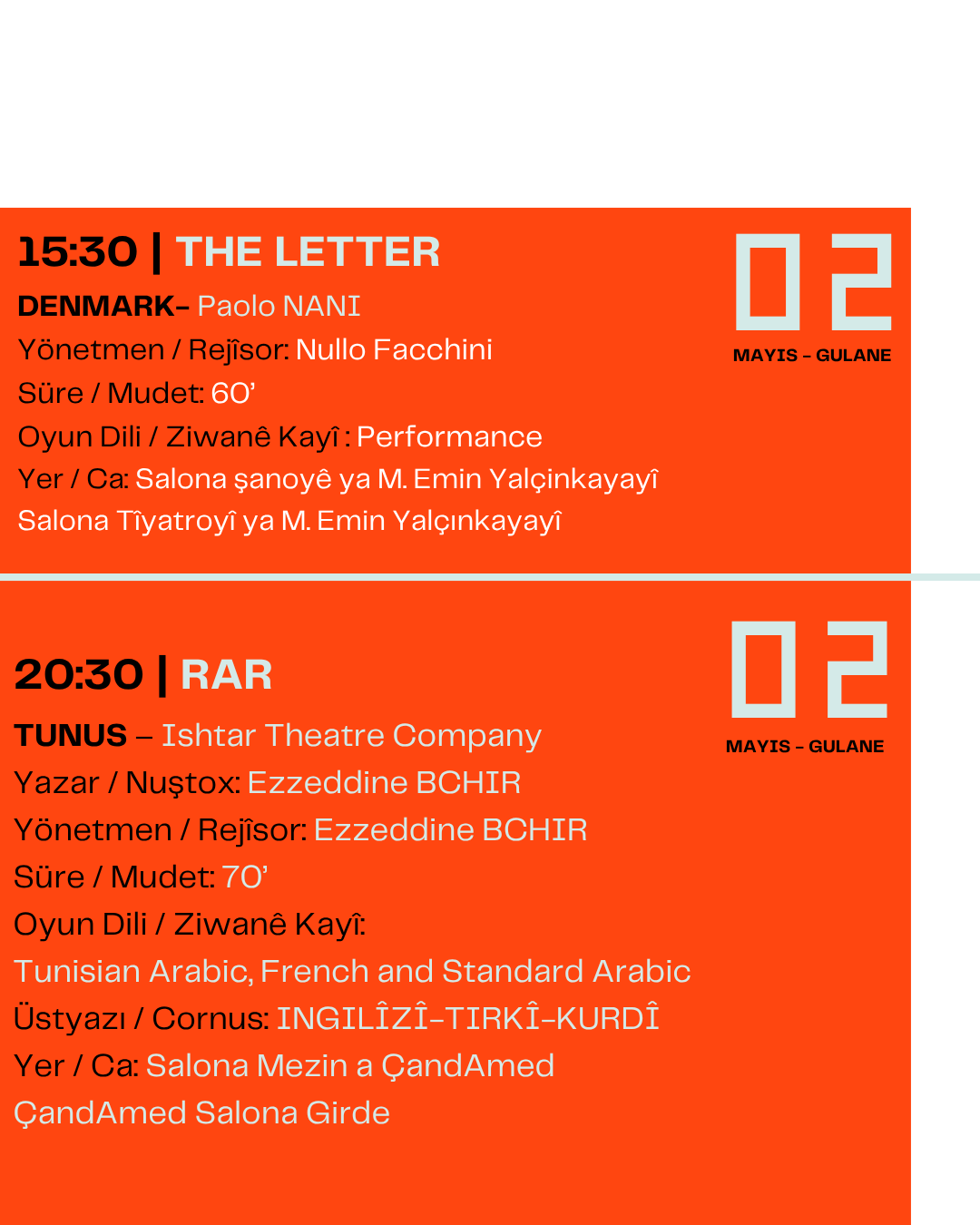 Festival kapsamında çok sayıda oyun, atölye ve söyleşi sanatseverlerle buluşacak. Gösterimlerin büyük bölümü Çand Amed Kültür ve Kongre Merkezi’nde gerçekleştirilecek.