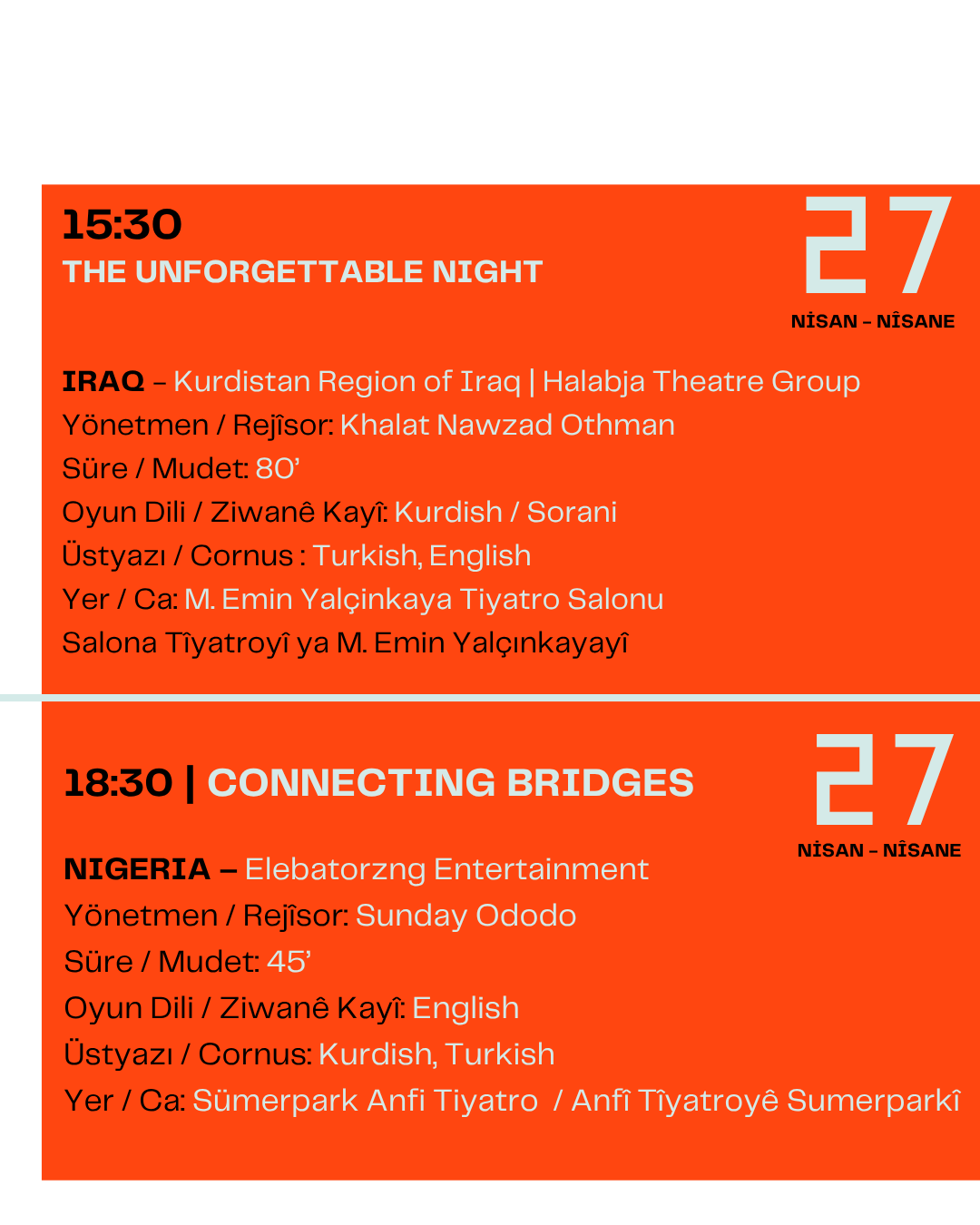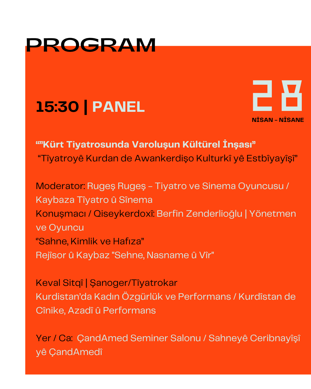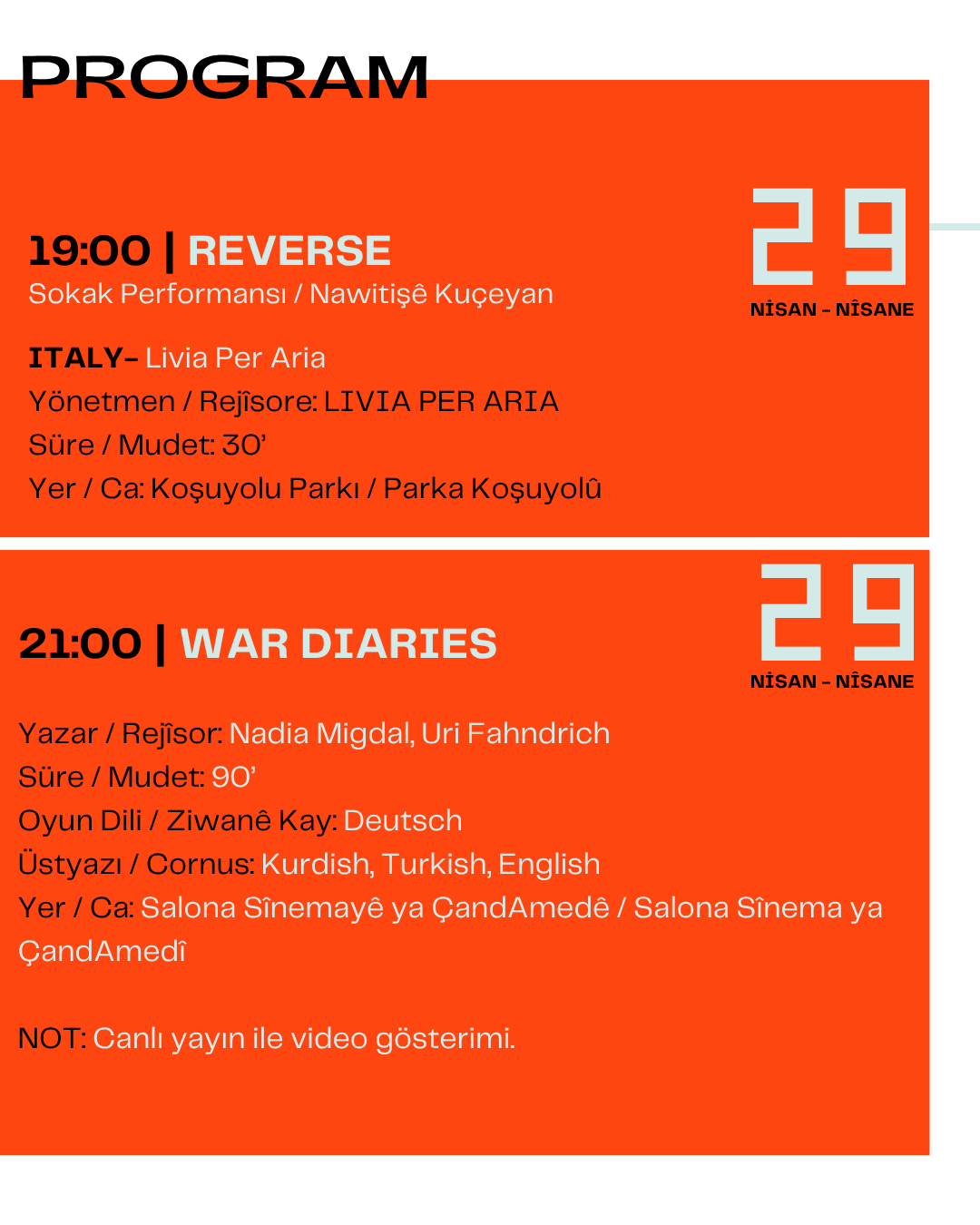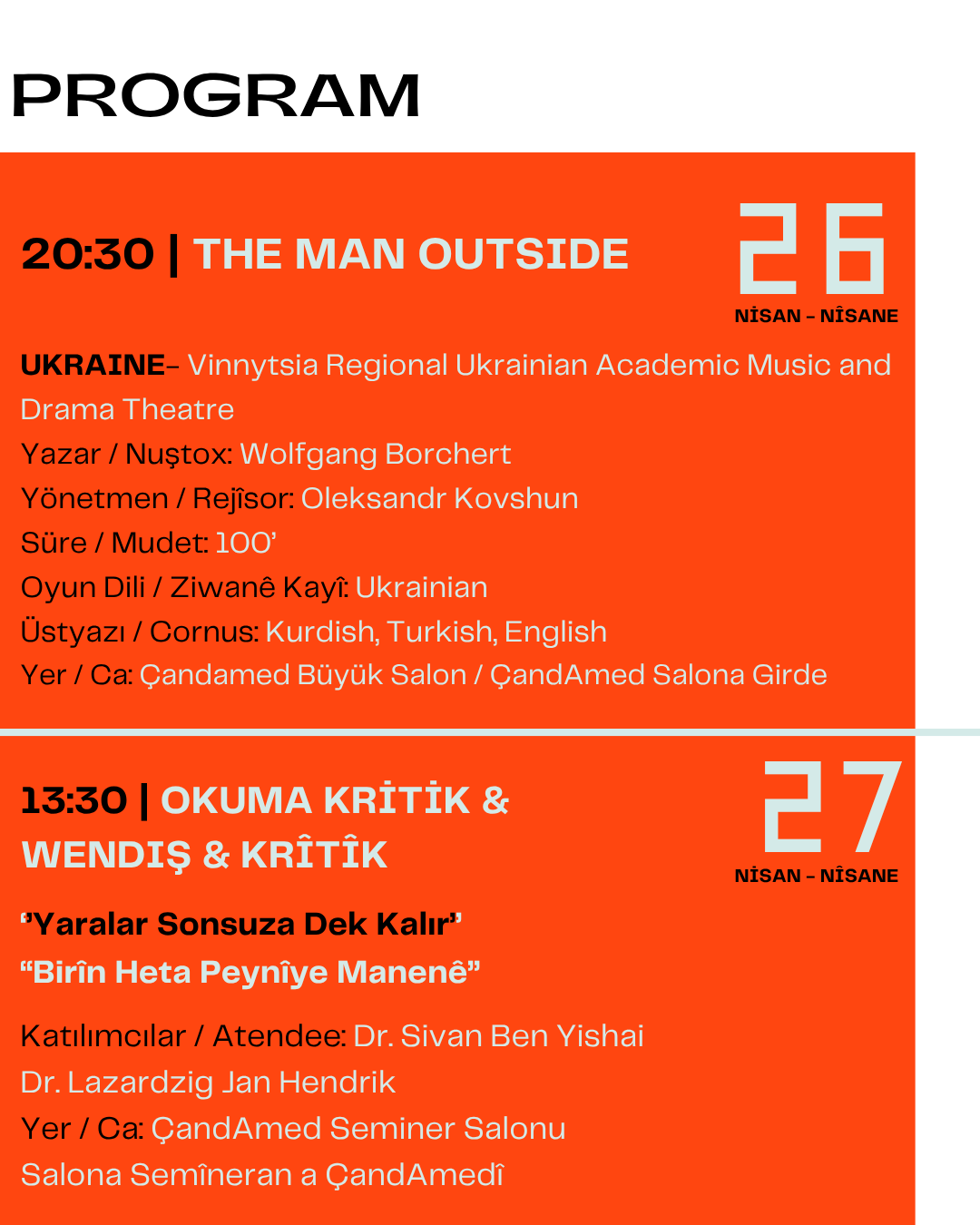 Festival kapsamında çok sayıda oyun, atölye ve söyleşi sanatseverlerle buluşacak. Gösterimlerin büyük bölümü Çand Amed Kültür ve Kongre Merkezi’nde gerçekleştirilecek.