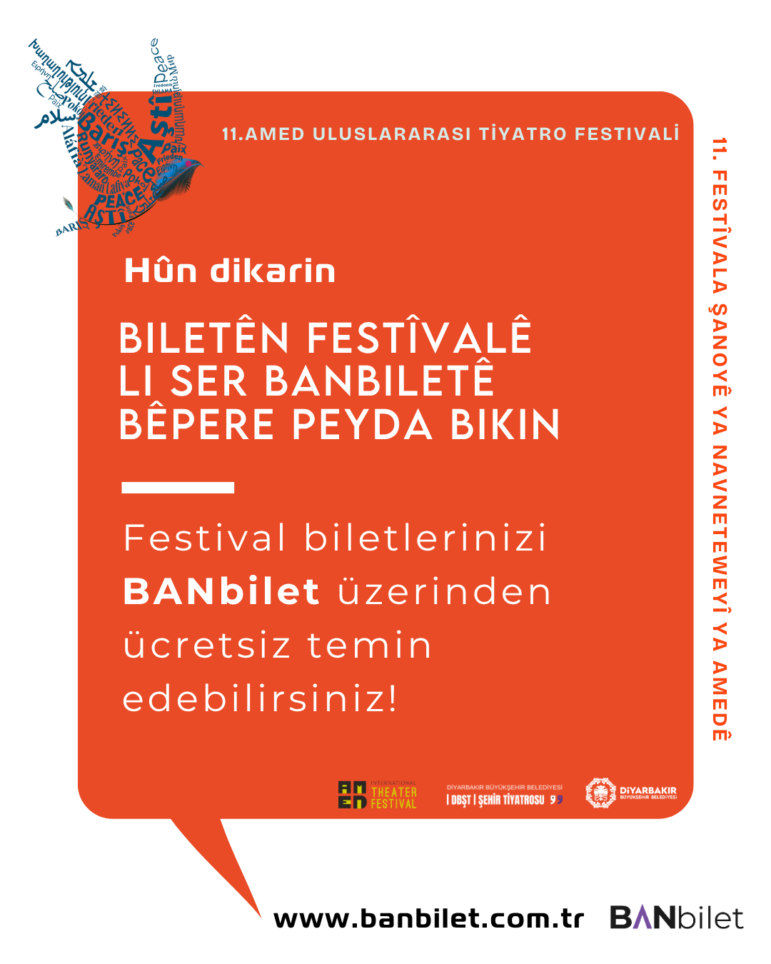 Diyarbakır Büyükşehir Belediyesi Şehir Tiyatrosu (DBŞT) tarafından düzenlenen 11. Uluslararası Amed Tiyatro Festivali, “Barış İçin Diyalog” temasıyla 22 Nisan’da başlıyor. 2 Mayıs’a kadar sürecek festivalde, farklı ülkelerden tiyatro toplulukları Diyarbakır’da sahne alacak.