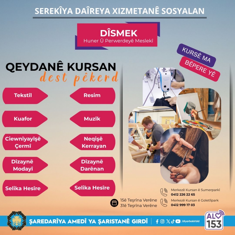 Şaredarîya Amedî ya Şaristanê Girdî seba kesanê ke 16 serran ra corêr ê û wazenê warê huner û meslekî de xo aver berê, kursê ma yê bêpereyî dayî destpêkerdene.