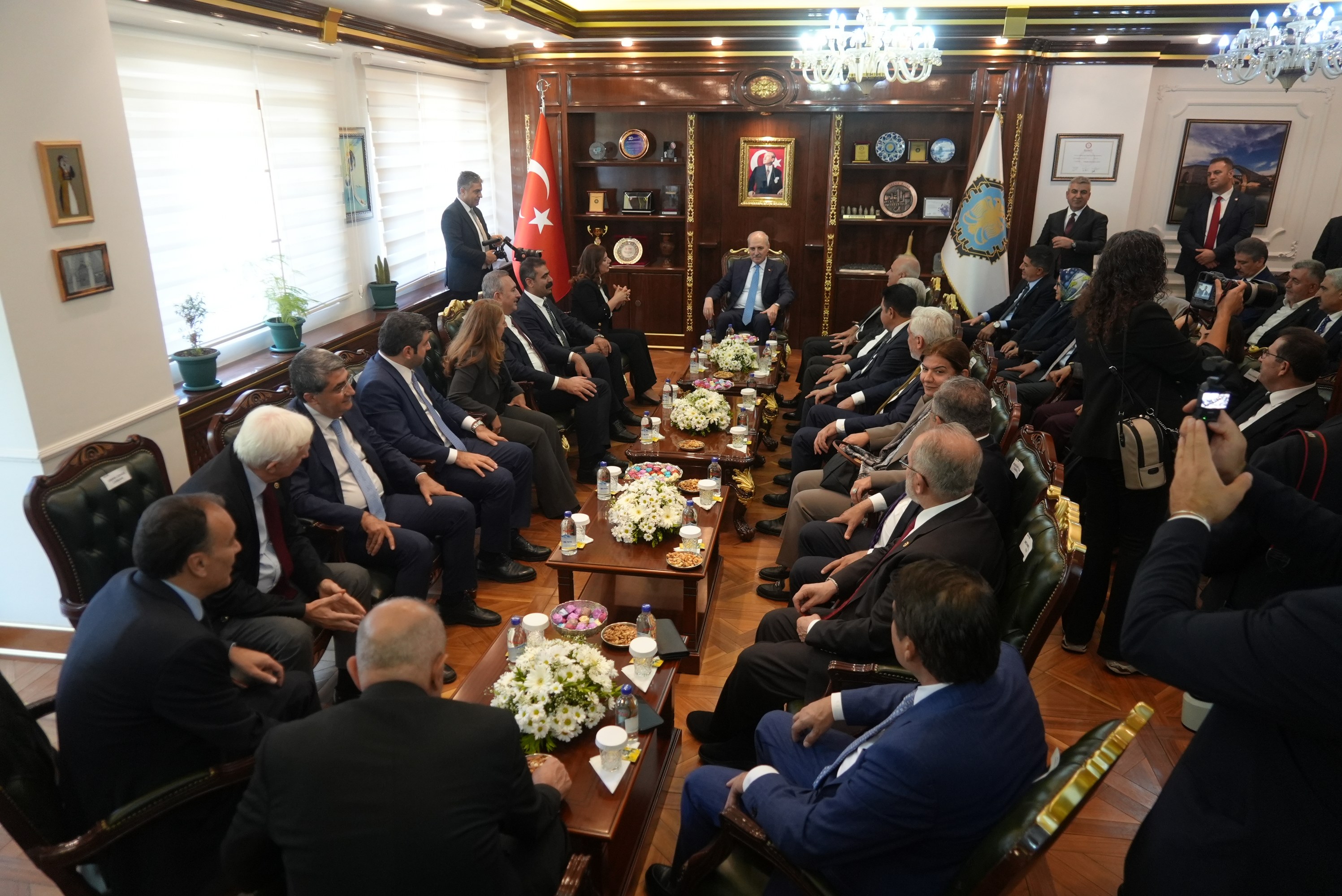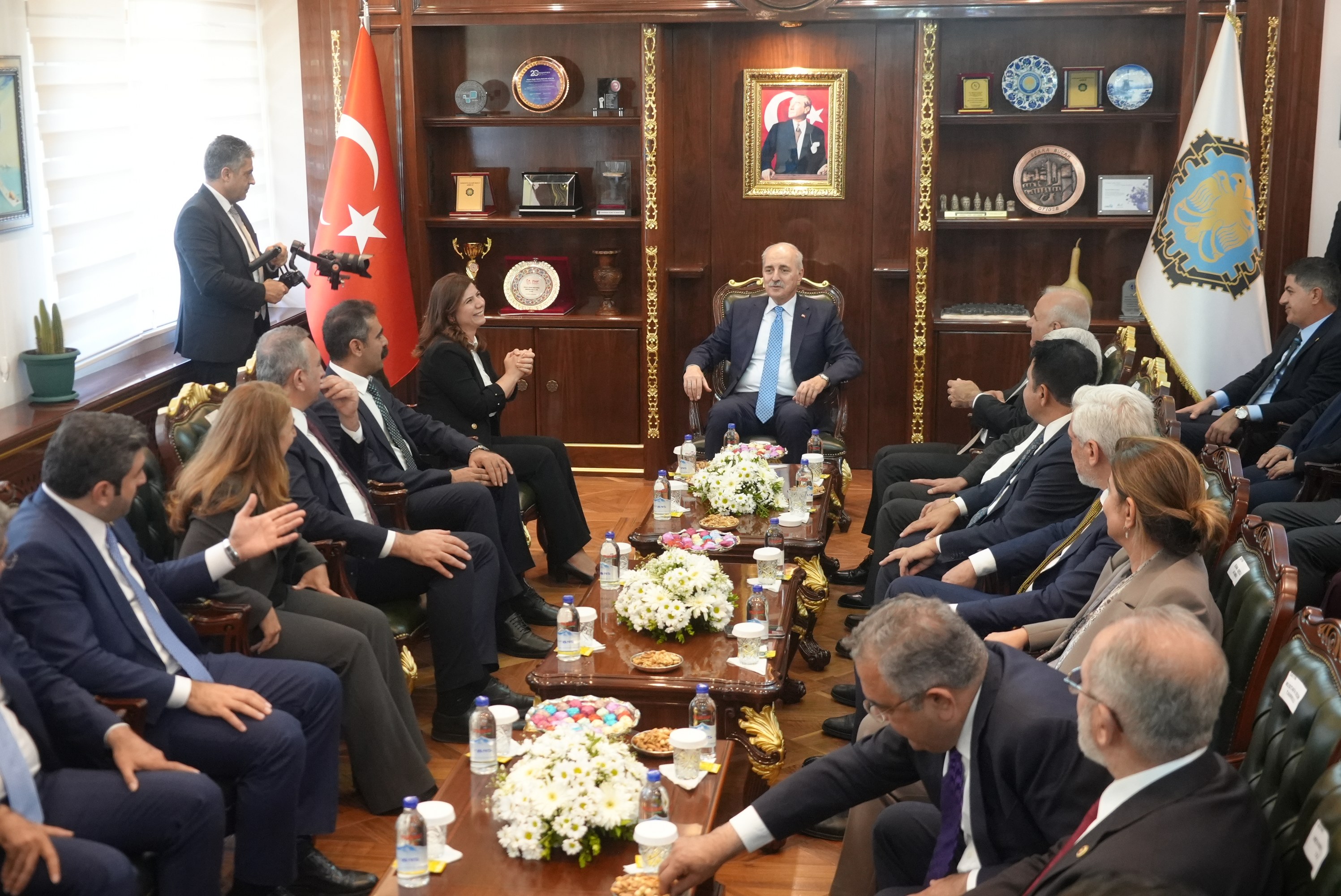 Hemşaredaranê Amedî yê Şaristanê Girdî Serra Bucak û Dogan Hatunî, Serekê TBMM'yî Numan Kurtulmuş, endamê Komîsyonê Demokrasî, Wayûbiratî û Piştîpêdayîşê Mîllîyî û Walîyê Amedî Murat Zorluoglu ke seba tayê têkilîyan ameybî Amed, awanîya şaredarîye de pêşwazî kerd.