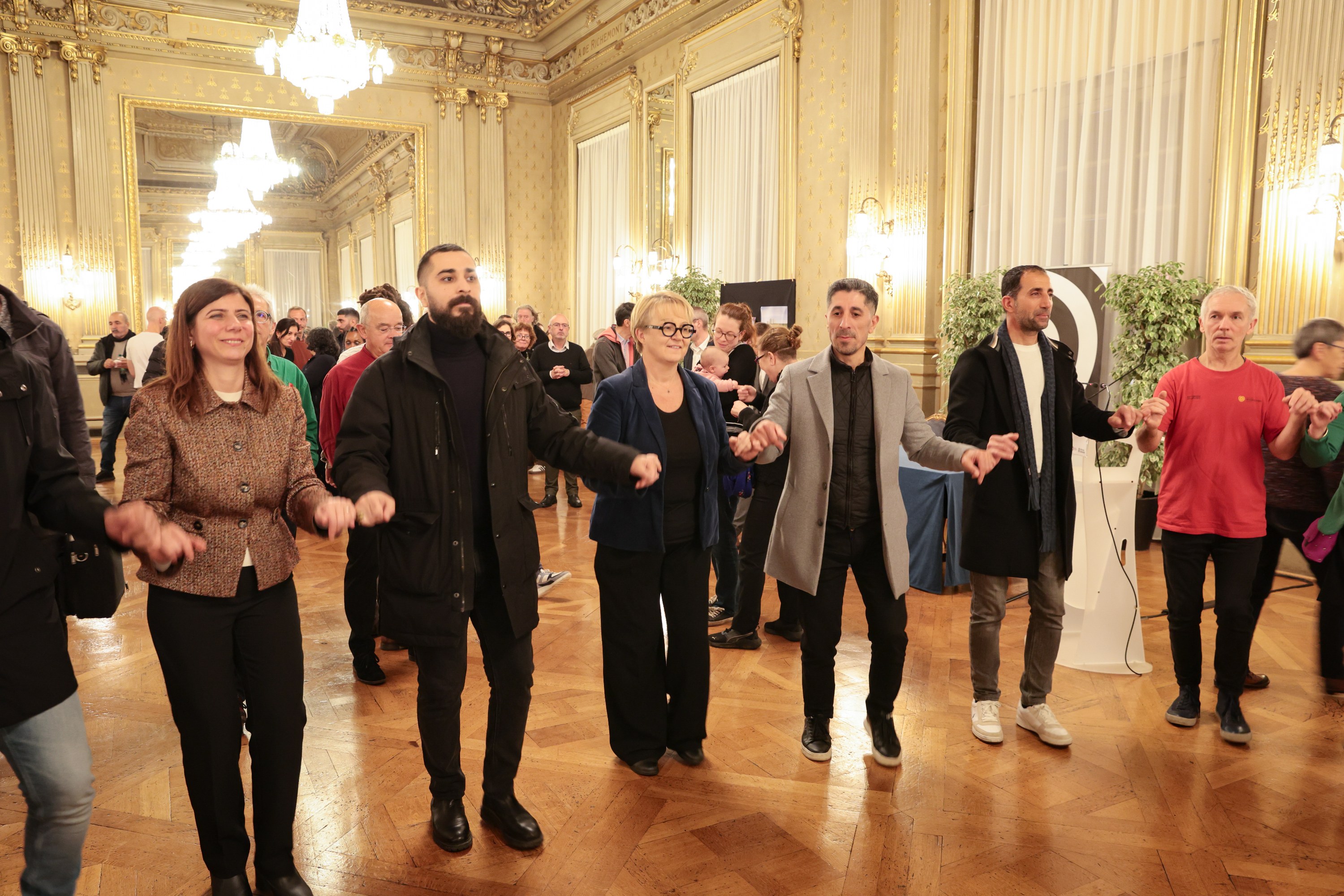 Badê merasîmê îmzakerdişî Hemşaredarê Bucak û Hatun, Şaredara Şaredarîya Rennesî Nathalie Appéré û beşdaran reyde govende girewte.