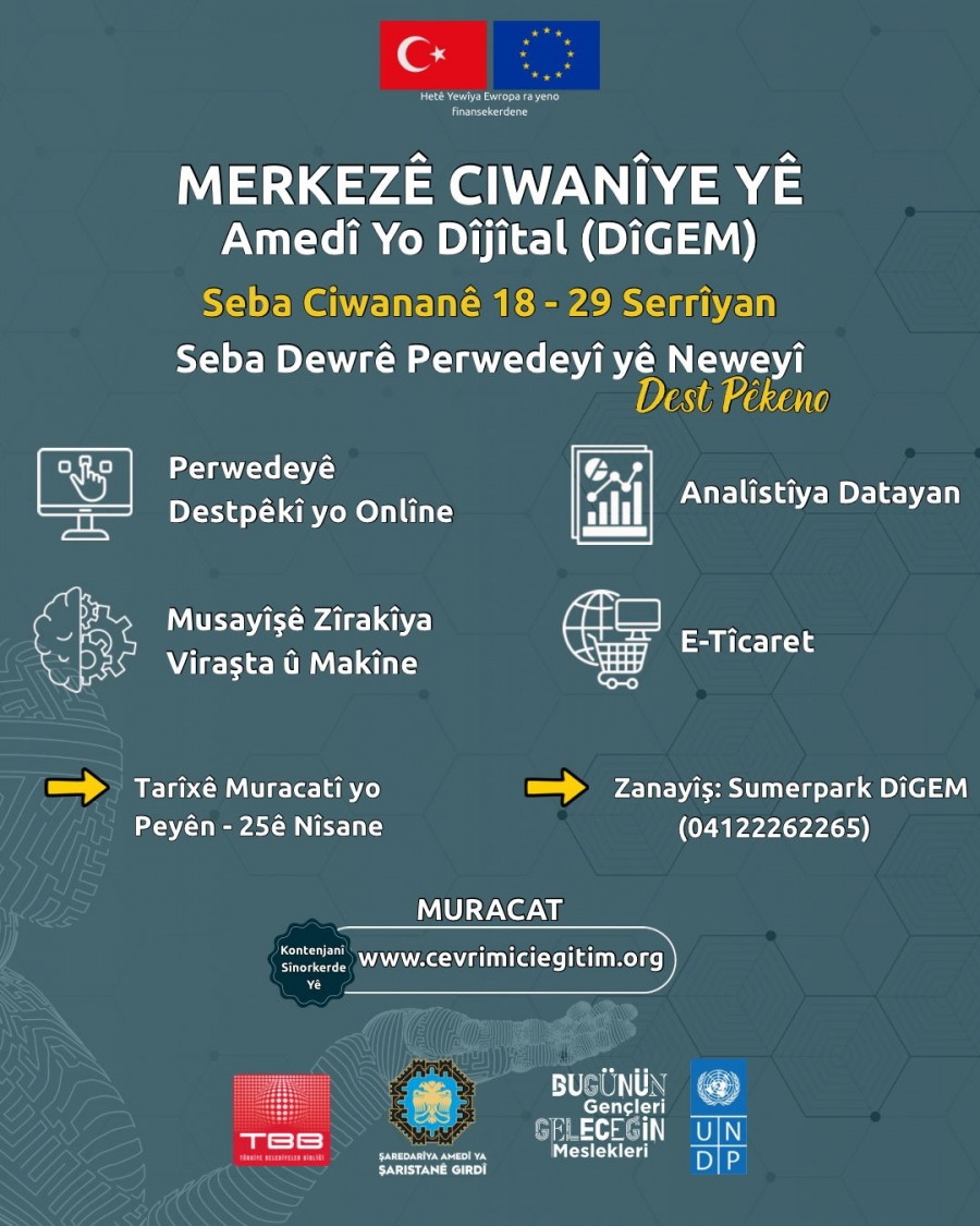 Na çarçewa de bi bernameyê ke do Merkezê Ciwananê Dîjîtal (DÎGEM) de bêro viraştene, ciwanê 18-29 serrîyê ke nêxebitîyenê, do beşanê stratejîkan ê sey e-tîcaret, analîstîya daneyan, aqilê destkarî de perwerde bigîrê.