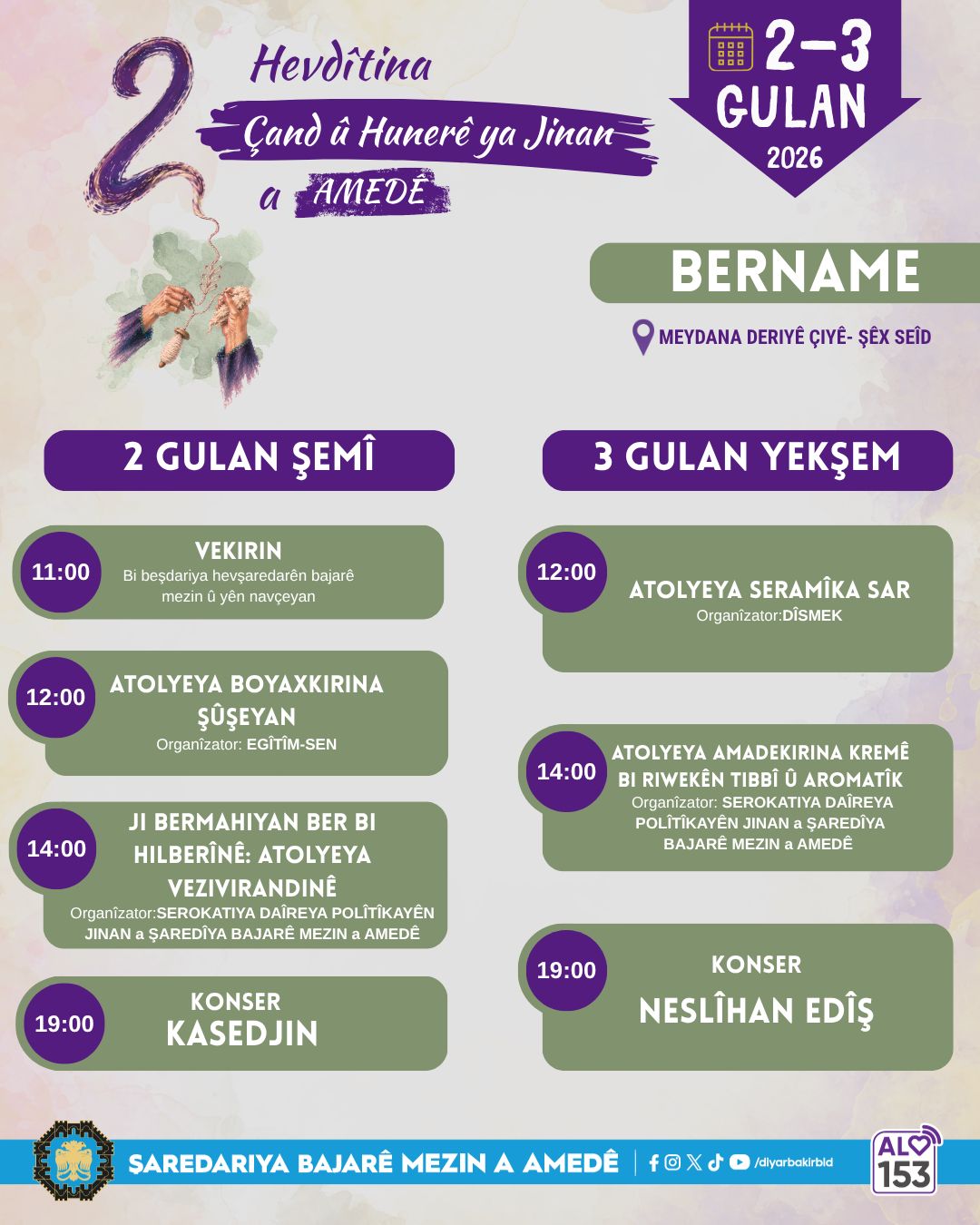 Bi pêşengîya Serekîya Daîreya Polîtîkayanê Cinîyan, bi beşdarîya şaredarîyanê qezayan, rêxistinanê komelê sîvîlî û koperatîfan, mîyanê tarîxê 2-3ê gulane de Pêdîyayîşê Cinîyan ê Kede û Kultur-Hunerî yê Amedî yo 2. do bêro organîzekerdene.